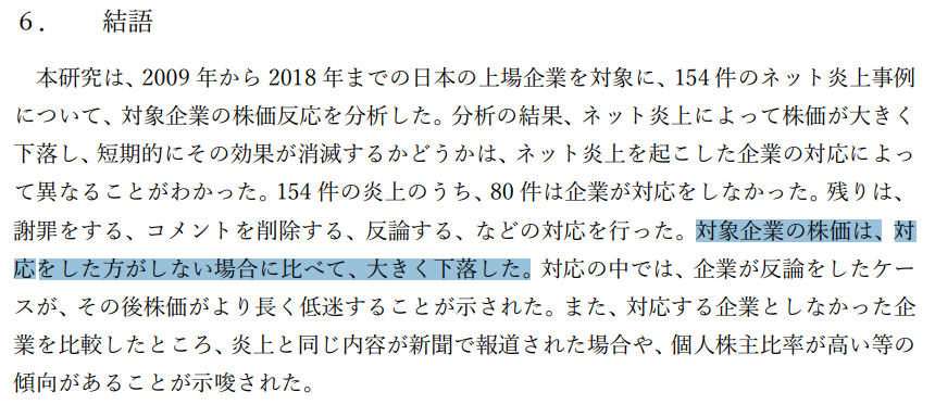 「ネット炎上が株式市場に与える影響」に関する研究論文によると、「炎上に対応した企業のほうがしなかった企業より株価が大きく下落した」という身も蓋もない結論だった