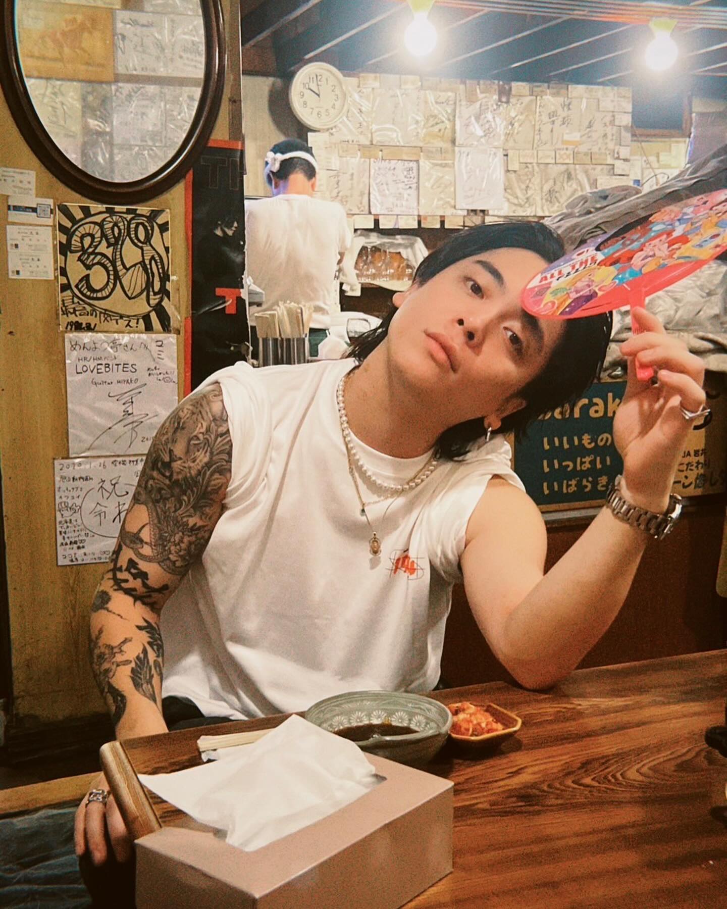 《優里ってこんなビジュアルだったんだな…。なんか声と顔とタトゥーとNBの服との印象全てが合致しない なんか勝手にふわふわパーマの薄めの顔で華奢でベージュのセットアップスーツに白いTシャツとか着てそうなイメージあったわ》
