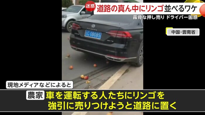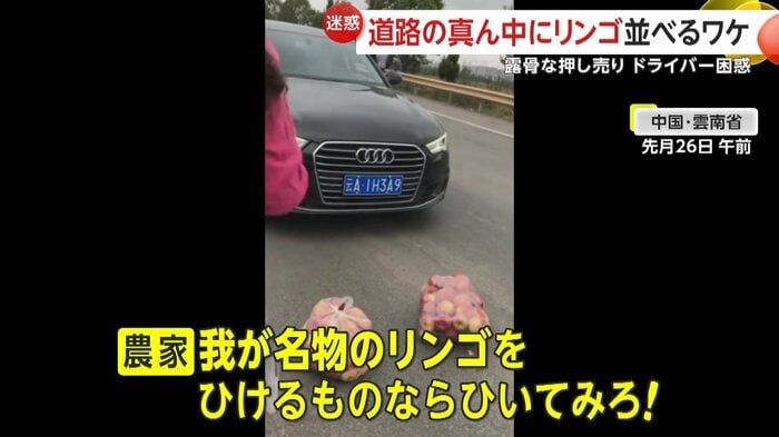 現地メディアなどによると、農家の人たちは車を運転する人たちに「リンゴを強引に売りつけたかったから」道路に置いたのだという。