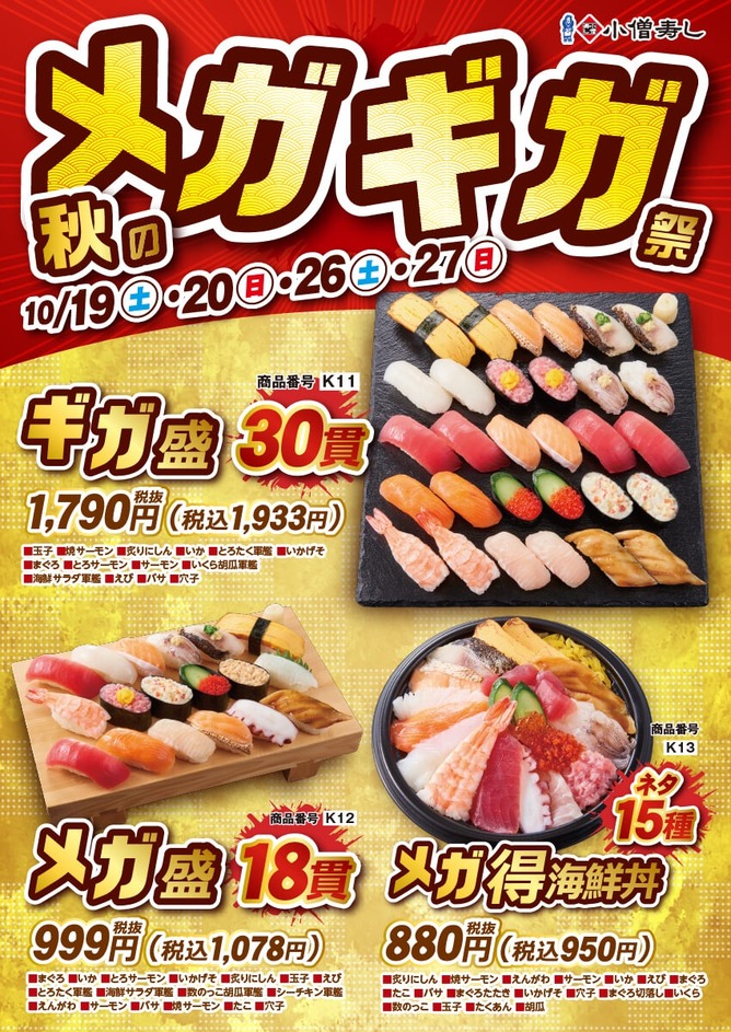 持ち帰り寿司店「小僧寿し」は「秋のメガギガ祭」を実施。まぐろやサーモンなど人気ネタ14種類が入った「ギガ盛 30貫」、17種の多彩なネタが楽しめる「メガ盛 18貫」、15種類の具材を楽しめる「メガ得 海鮮丼」といったボリュームがあってお得なメニューを販売する。