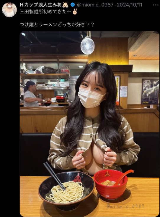 Yahoo!ニュース三田製麺所初めてきた~つけ麺とラーメンどっちが好き??〉──実にありふれたX(旧Twitter)への投稿。しかし、テーブルでつけ麺を前にした女性は、なぜか服をめくり、豊満な胸をむき出しにしている。背景に映り込んだ店員は、客の女性のあられもない姿に気づいていないようで、忙しそうに作業をしている。