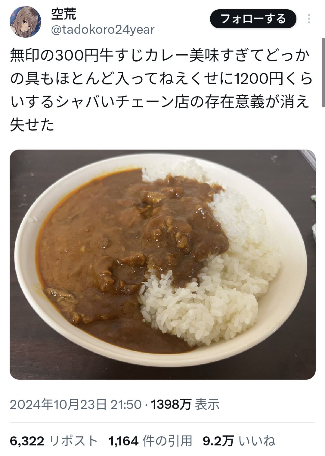無印の300円牛すじカレー美味すぎてどっかの具もほとんど入ってねえくせに1200円くらいするシャバいチェーン店の存在意義が消え失せた pic.twitter.com/EVO7lV8DMY