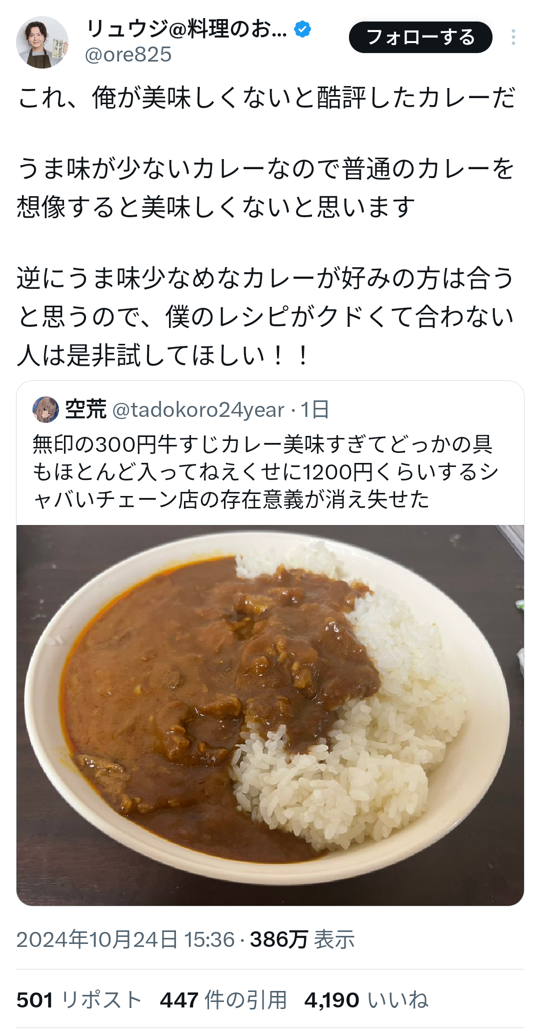 — リュウジ@料理のおにいさんバズレシピ (@ore825) October 24, 2024