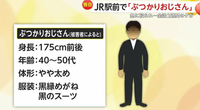 ぶつかりおじさんは、身長175cm前後の40代から50代の男性。やや太めの体形で、黒縁の眼鏡をかけ、黒いスーツを着ていたという。