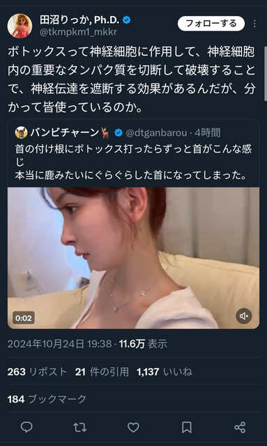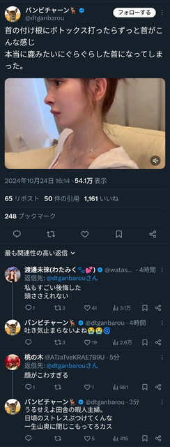 本当に鹿みたいにぐらぐらした首になってしまった。 pic.twitter.com/wdVkUlt2VP— バンビチャーン?? (@dtganbarou) October 24, 2024