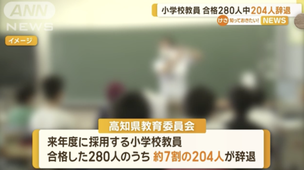 高知県教育委員会は、来年度に採用する小学校の教員について、合格した280人のうち、およそ7割にあたる204人が辞退したと明らかにしました。