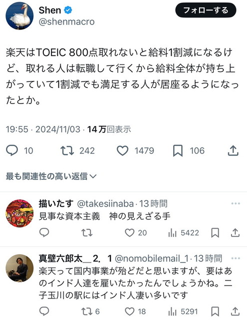 楽天はTOEIC 800点取れないと給料1割減になるけど、取れる人は転職して行くから給料全体が持ち上がっていて1割減でも満足する人が居座るようになったとか。