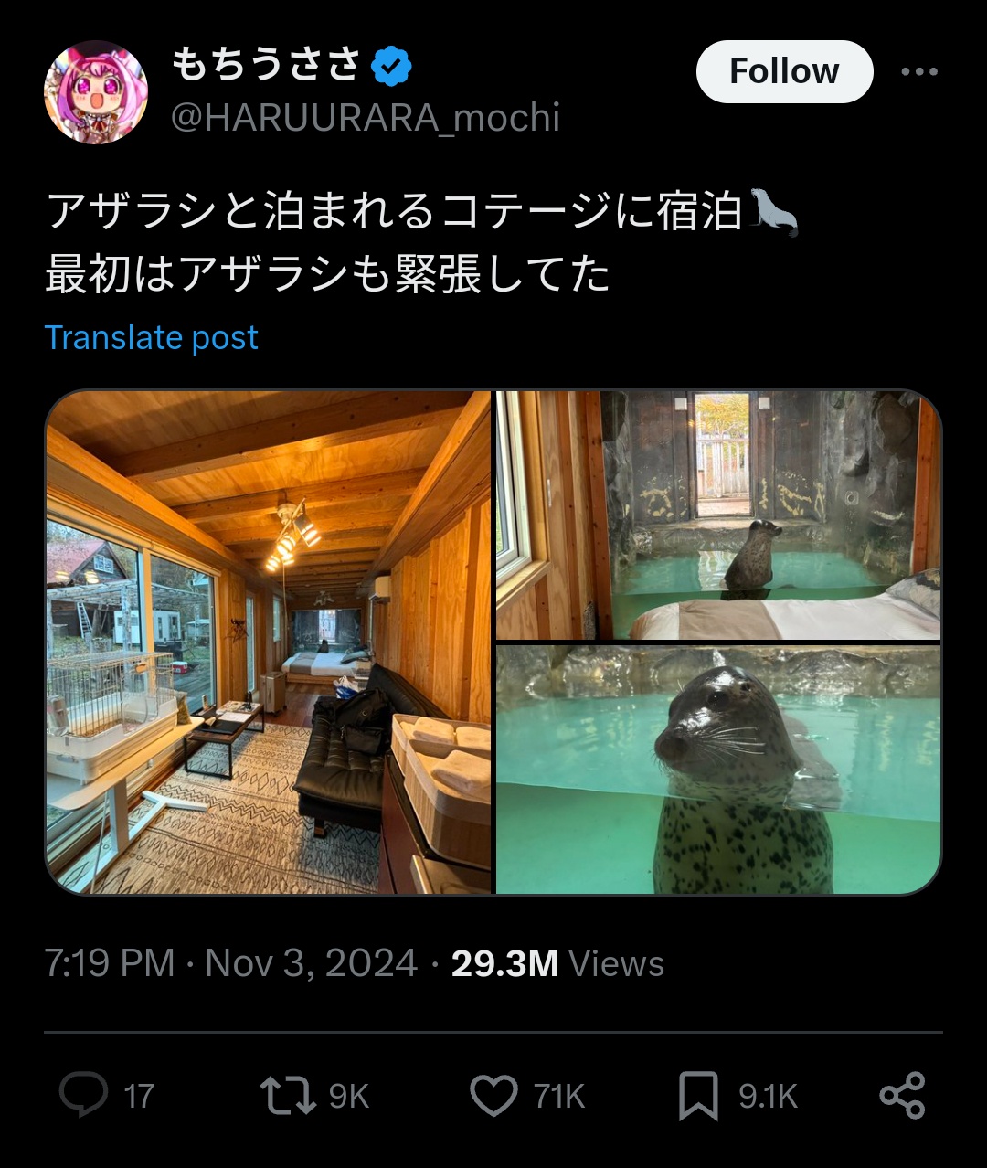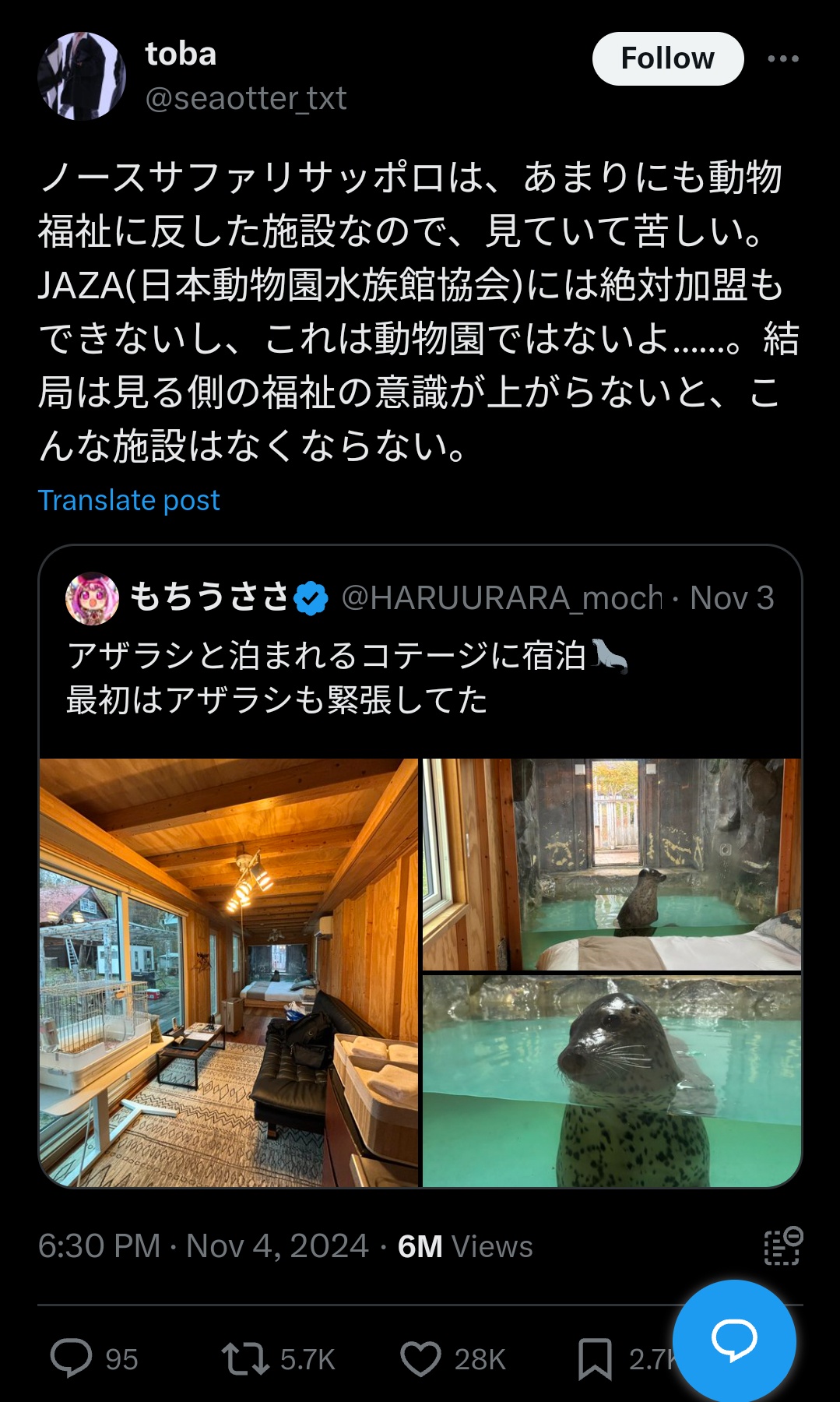 【悲報】X民「アザラシと泊まれるコテージ行ってきた!」←動物虐待だと炎上 2024/11/5 キニ速 1:名無し: 2024/11/05(火) 09:34:43.373 ID:D4doZsDQW 6:名無し: 2024/11/05(火) 09:36:30.603 ID:4jgLUmqwR かわよ 5:名無し: 2024/11/05(火) 09:35:54.110 ID:fOoKwdWRR 狭くて草 続きを読む Source: キニ速