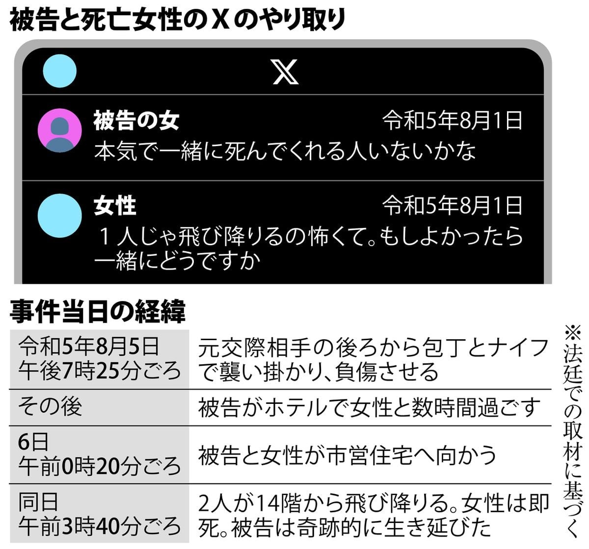女は元交際相手を刃物で刺し、その後、市営住宅の14階から飛び降り自殺を図った。それも1人ではなく、X(旧ツイッター)で出会ったばかりの女性とともに。地上からの高さは約40メートル。