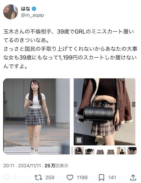 「服くらい買ってあげなよ」玉木雄一郎不倫相手の“激安ミニスカ”が判明、逢瀬に履いたその値段(週刊女性PRIME) – Yahoo!ニュース11月11日、国民民主党の玉木雄一郎代表が、香川県の高松市観光大使を務める元グラビアアイドルの小泉みゆき(39)と不倫関係にあることが報じられた。(中略)「不倫現場の写真を見ると、小泉さんが着用しているスカートは『GRL』というブランドが発売している1199円の商品です。GRLといえば、超プチプラ価格帯のファッション通販サイトで、1000円台でトップスやボトムス、靴やアクセアリーなどを購入することができます。お財布に優しいことから、愛用者は10代から20代が多い印象です」あまりにも安いスカートの値段に、《今から不倫しに行くって時に1199円のスカートか…》