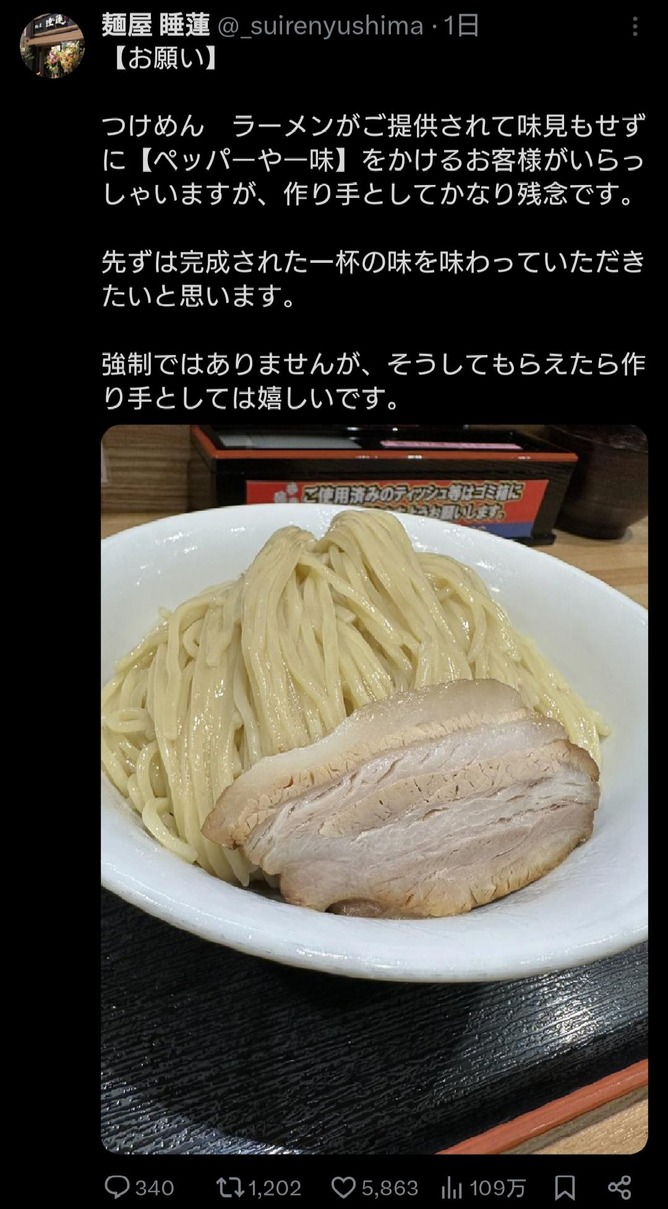 — 麺屋 睡蓮 (@_suirenyushima) November 15, 2024