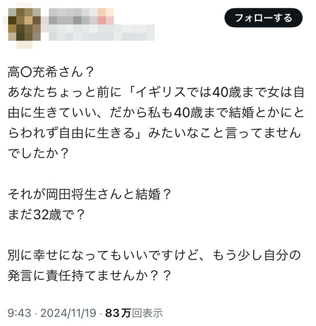 【悲報】X女さん「高畑充希さん、あんた前に40まで結婚にとらわれないって言ってたよね?」 2024/11/20 キニ速 1:名無し: 2024/11/20(水) 03:30:06.885ID:LfUAd1dvU 9:名無し: 2024/11/20(水) 03:33:19.202ID:Yt22lhC09 ※ただし高身長色白イケメンとなら結婚しても良いものとする 続きを読む Source: キニ速