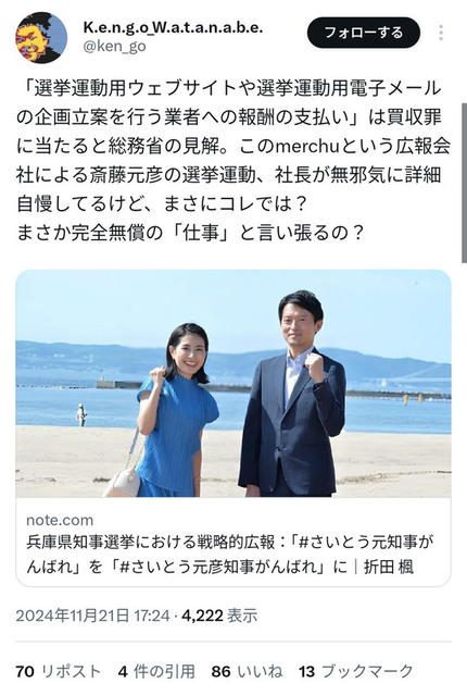 【魚拓】兵庫県知事選挙における戦略的広報:「#さいとう元知事がんばれ」を「#さいとう元彦知事がんばれ」に|折田 楓