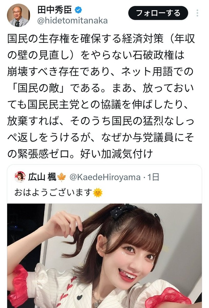国民の生存権を確保する経済対策(年収の壁の見直し)をやらない石破政権は崩壊すべき存在であり、ネット用語での「国民の敵」である。まあ、放っておいても国民民主党との協議を伸ばしたり、放棄すれば、そのうち国民の猛烈なしっぺ返しをうけるが、なぜか与党議員にその緊張感ゼロ。好い加減気付け https://t.co/MpyQyDa7xC