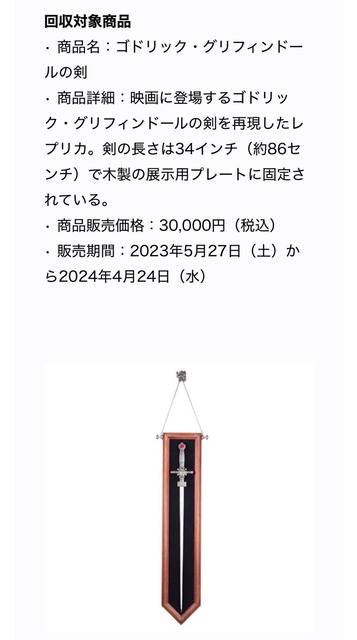 回収されるのは映画「ハリー・ポッター」の世界が体験できる東京・練馬区の「ワーナー ブラザース スタジオツアー東京」で販売されていたグッズの「ゴドリック・グリフィンドールの剣」です。
