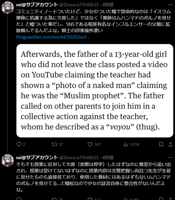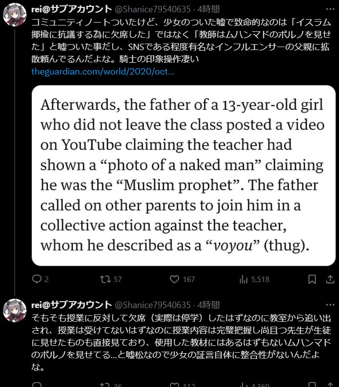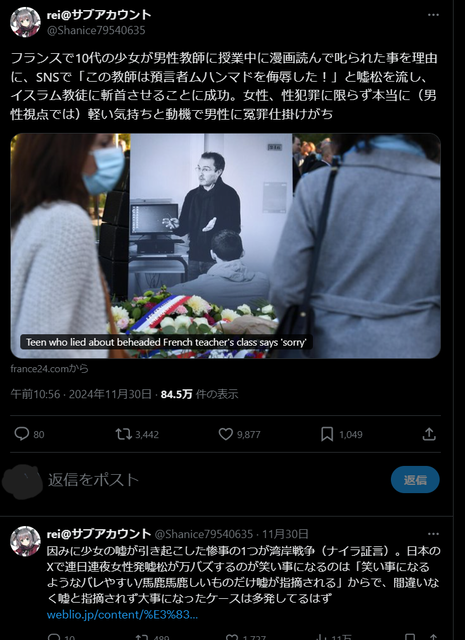フランスで10代の少女が男性教師に授業中に漫画読んで叱られた事を理由に、SNSで「この教師は預言者ムハンマドを侮辱した!」と嘘松を流し、イスラム教徒に斬首させることに成功。女性、性犯罪に限らず本当に(男性視点では)軽い気持ちと動機で男性に冤罪仕掛けがちhttps://t.co/Zxi63jDPd7