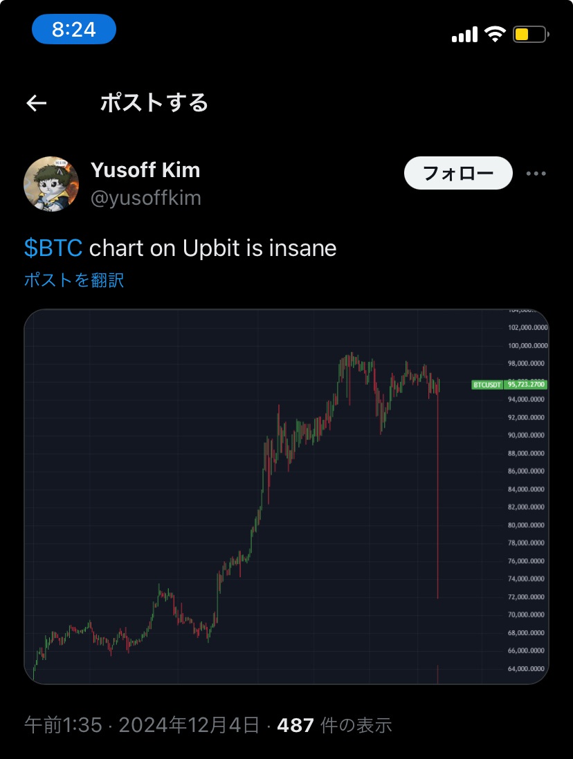 韓国、戒厳令を受けてビットコイン、XRPが一時30%下落