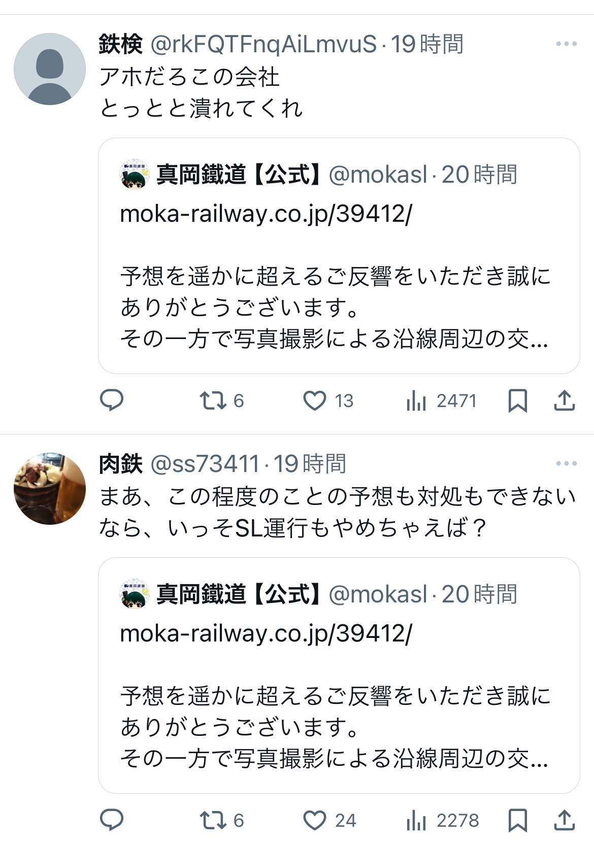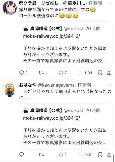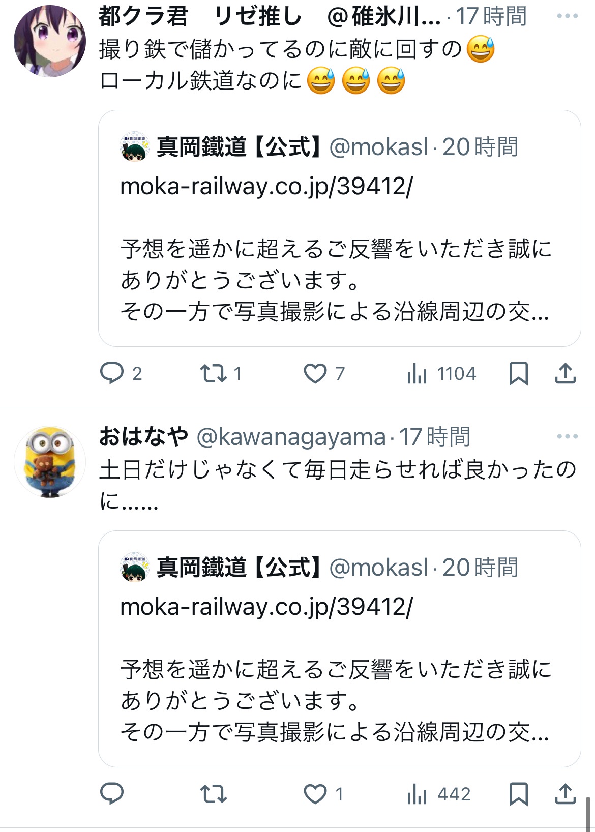 真岡鐵道は今回の企画にあたり、撮影に際しては近隣へ迷惑とならないよう撮影マナーに関して事前に告知しており、「公共の道を塞いでしまったり、線路内に近づいたりなどトラブル等が多発するようですと、企画も中止となる恐れがあります」とも警告していました。