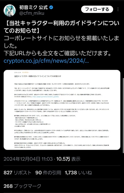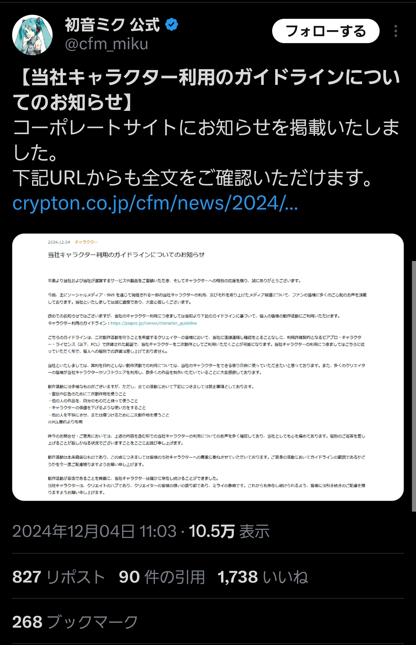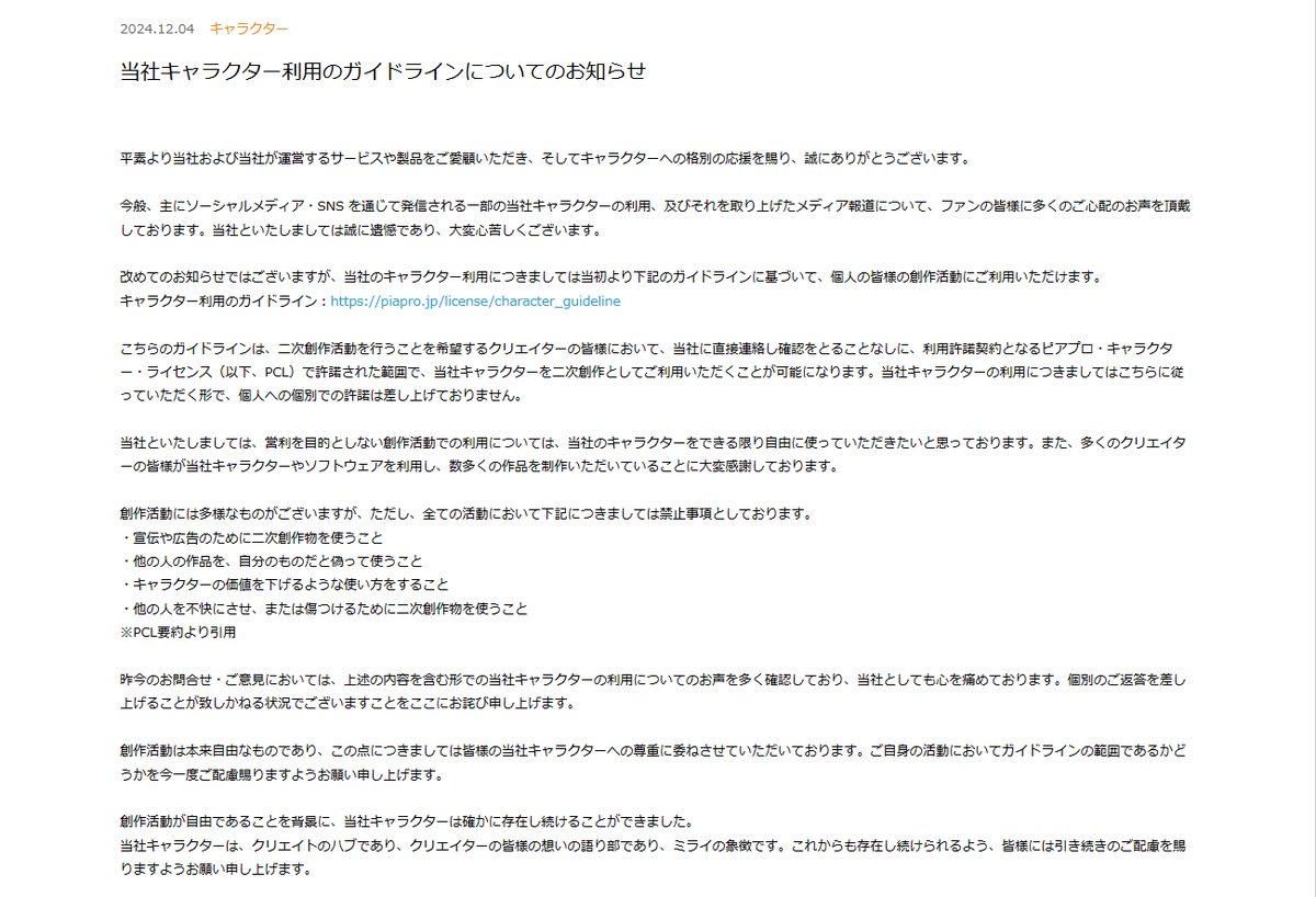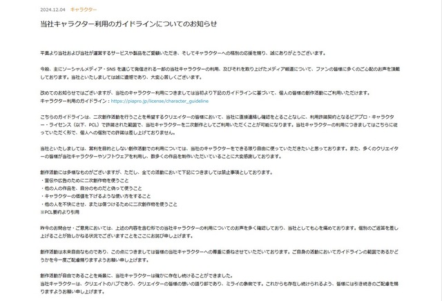 下記URLからも全文をご確認いただけます。https://t.co/jqGQRXd8Pr pic.twitter.com/81aV3YDwJr— 初音ミク 公式 (@cfm_miku) December 4, 2024