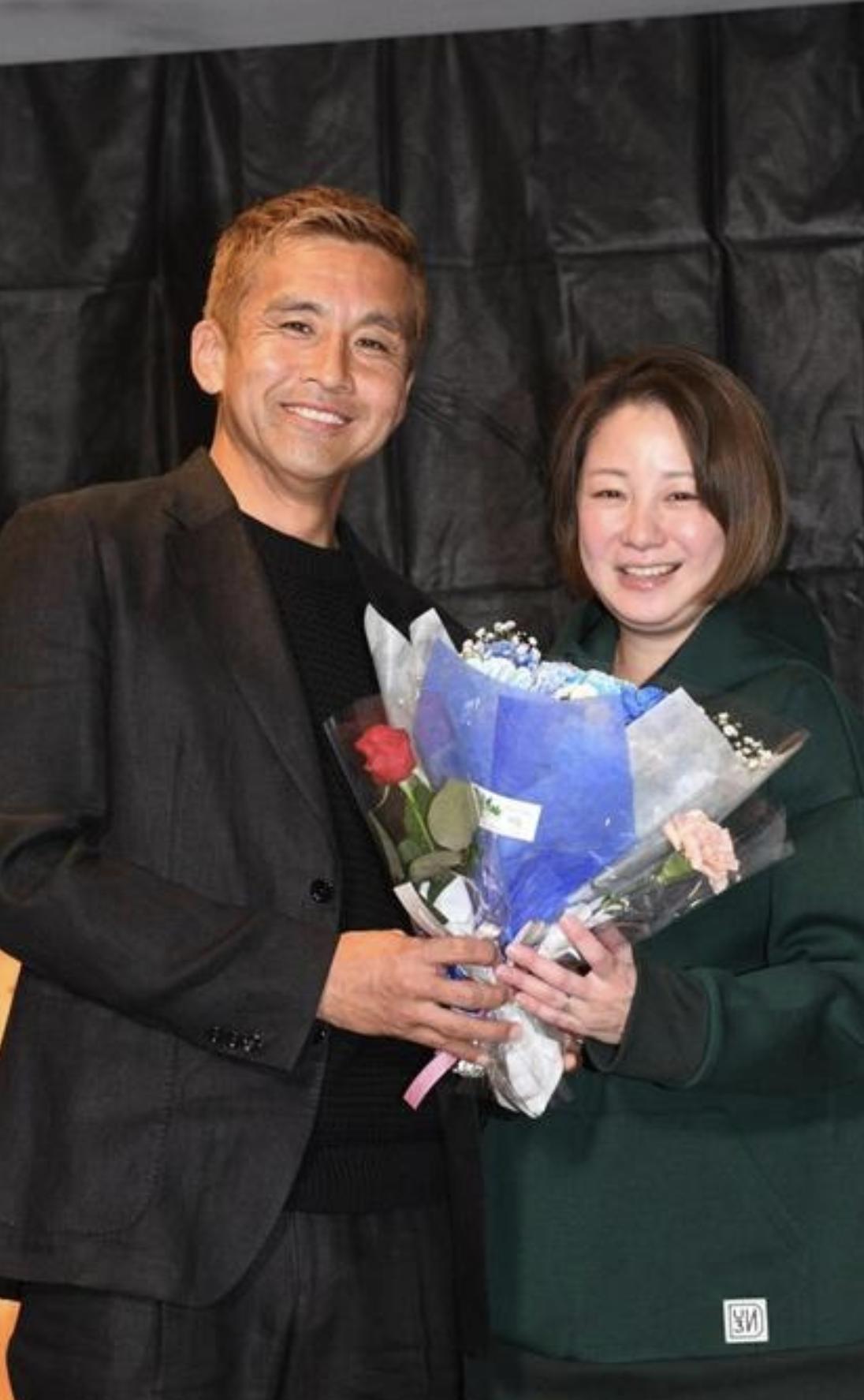 会見後には、妻でモデルの田中美保から花束を贈られ笑顔を見せる場面も。