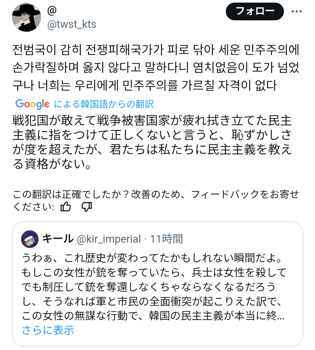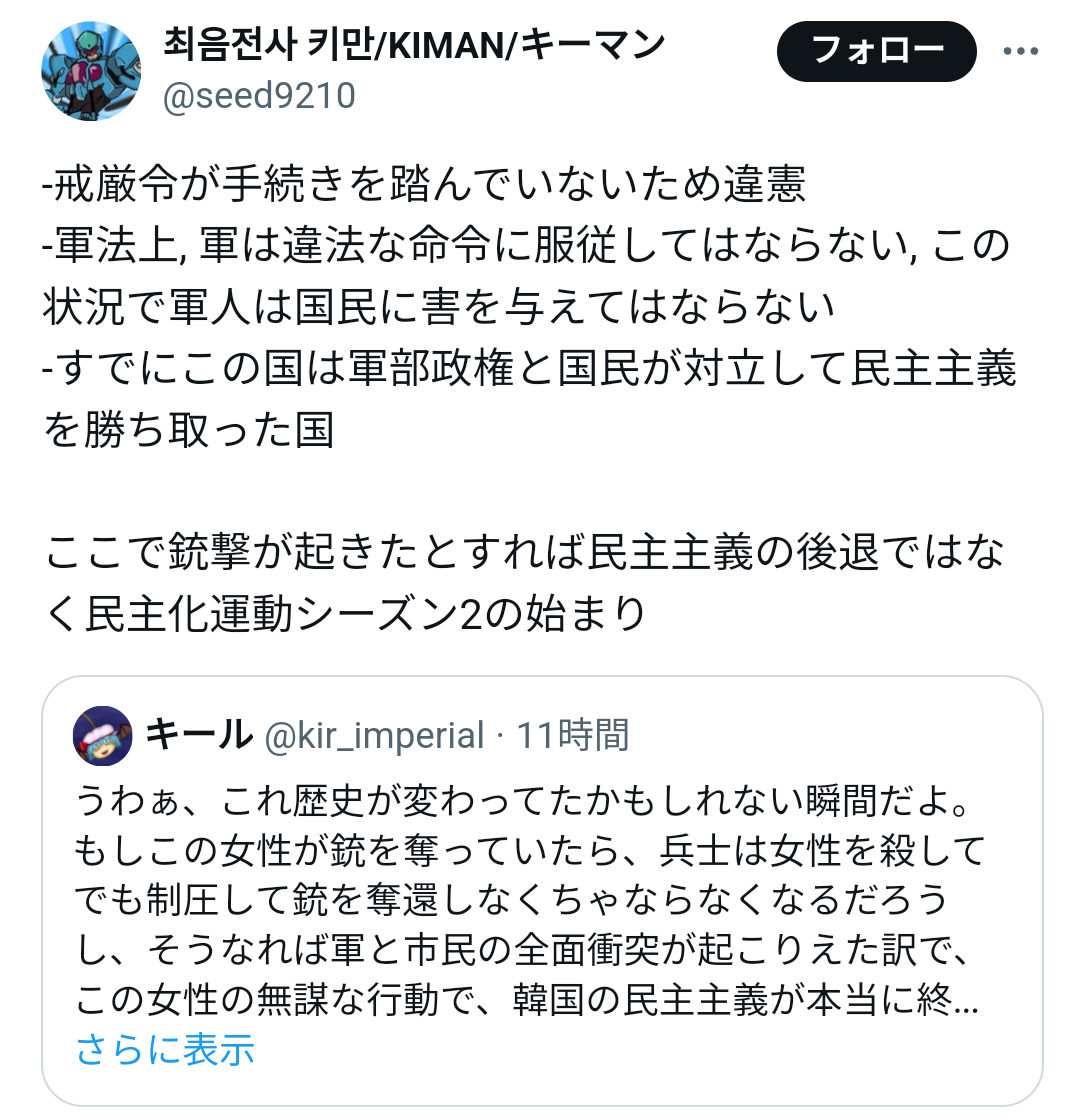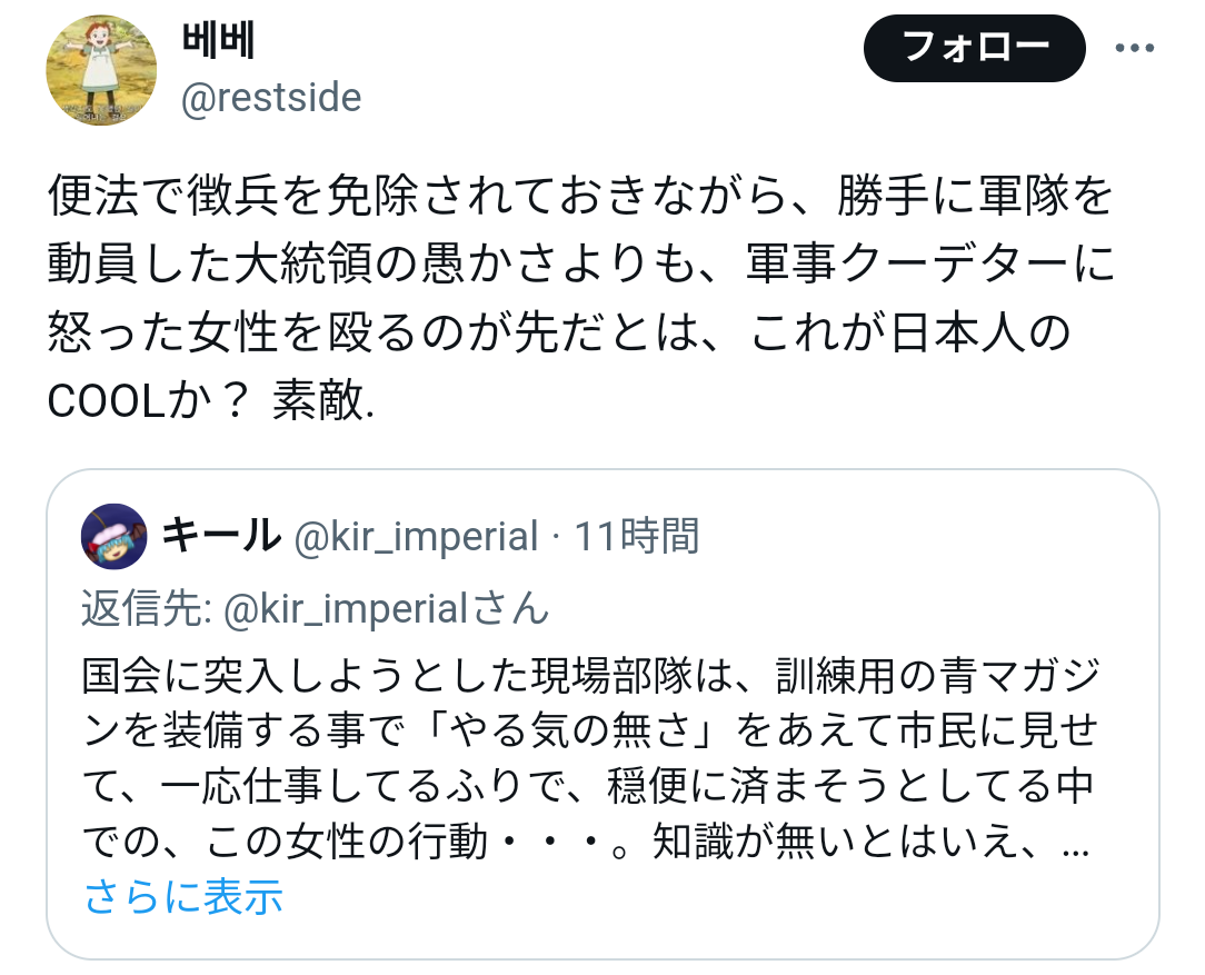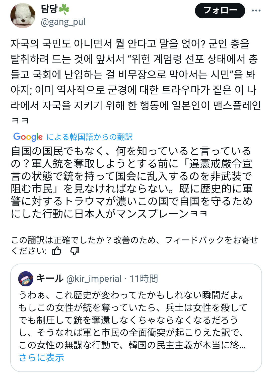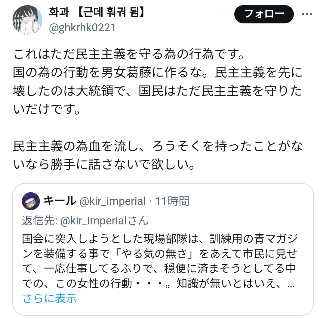 武装して国会に突入した戒厳軍になぜか肩入れし、丸腰で抵抗した女性を叩きながら民主主義を語ったところ、