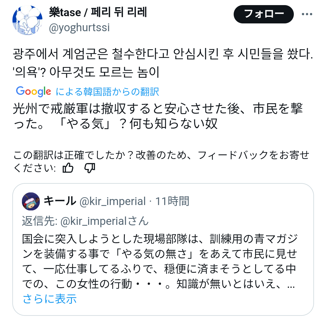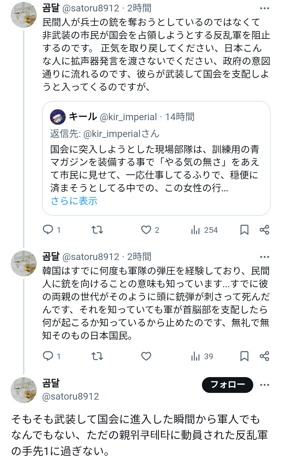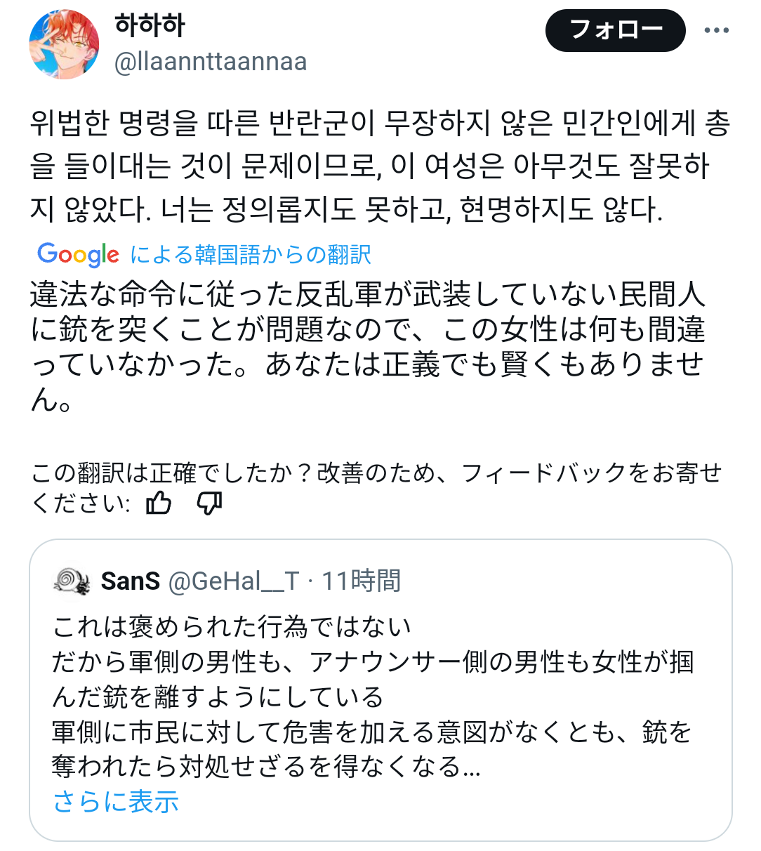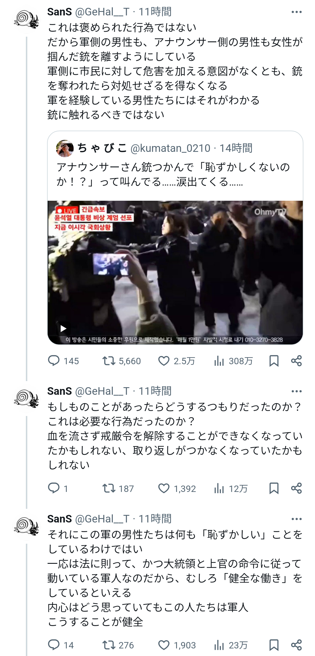 武装して国会に突入した戒厳軍になぜか肩入れし、丸腰で抵抗した女性を叩きながら民主主義を語ったところ、