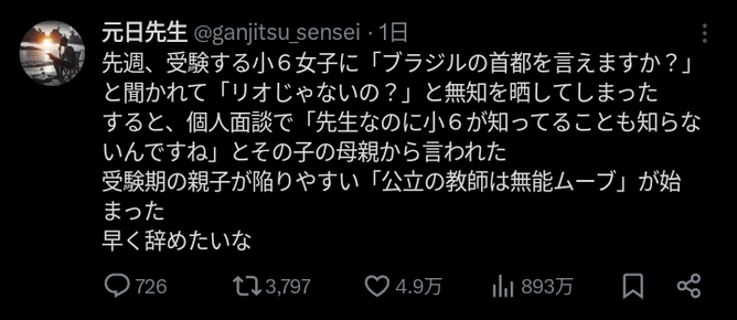 【悲報】小6女子「ブラジルの首都は?」先生「リオでしょ!」