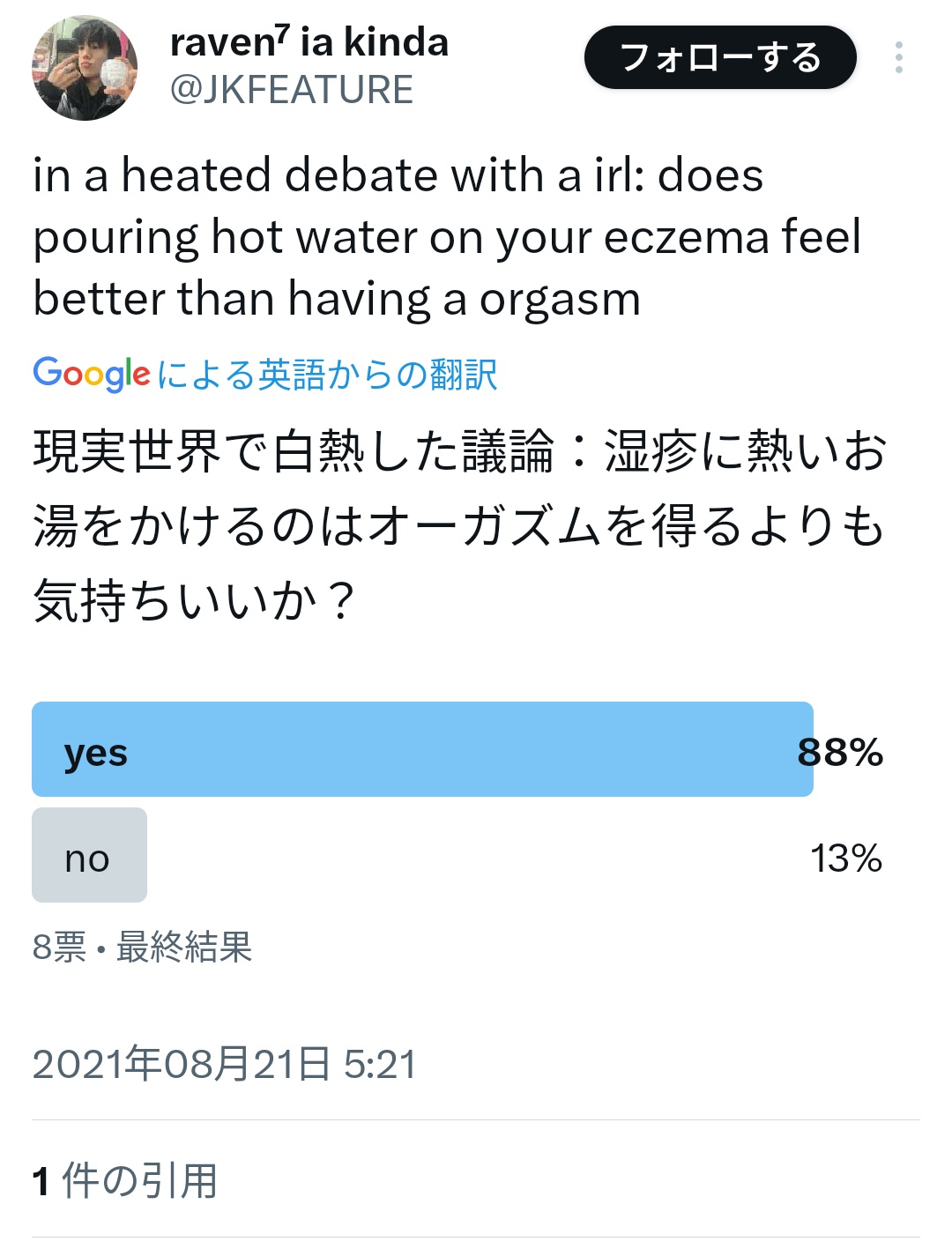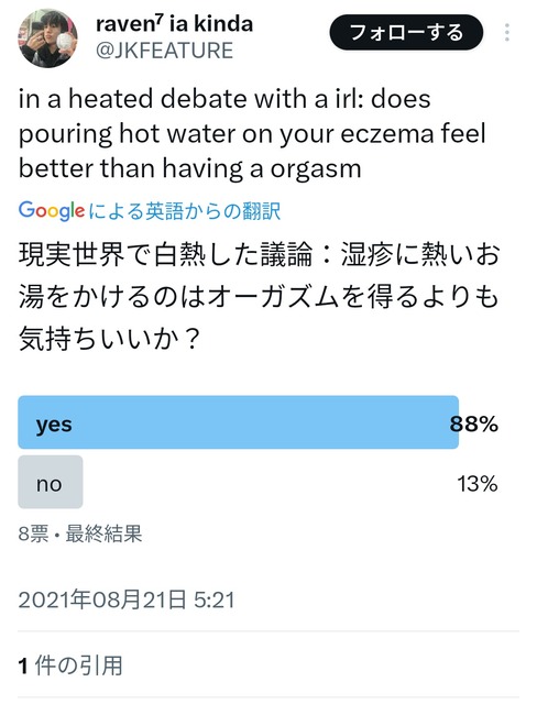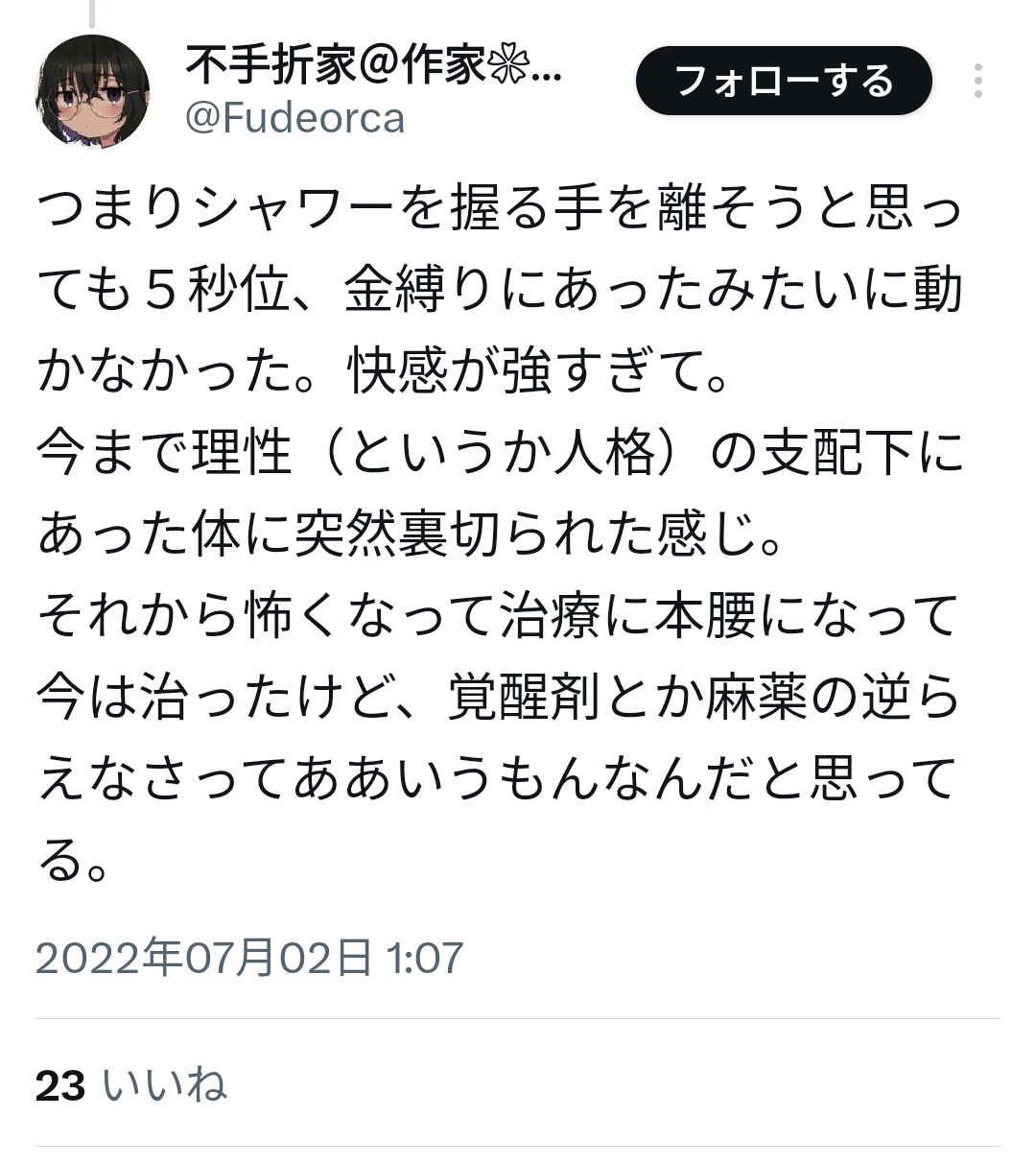 泣いた後のストレス解放や感動した時の鳥肌、自慰、最高に楽しい時の感情とか全部詰まって一発で喜びすべてを開放する感じ