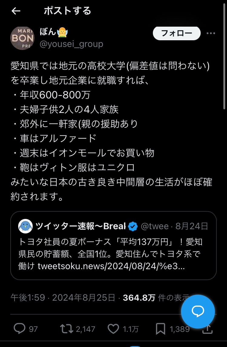 みたいな日本の古き良き中間層の生活がほぼ確約されます。 https://t.co/IVAuohmsph— ぼん🧚♀️ (@yousei_group) August 25, 2024
