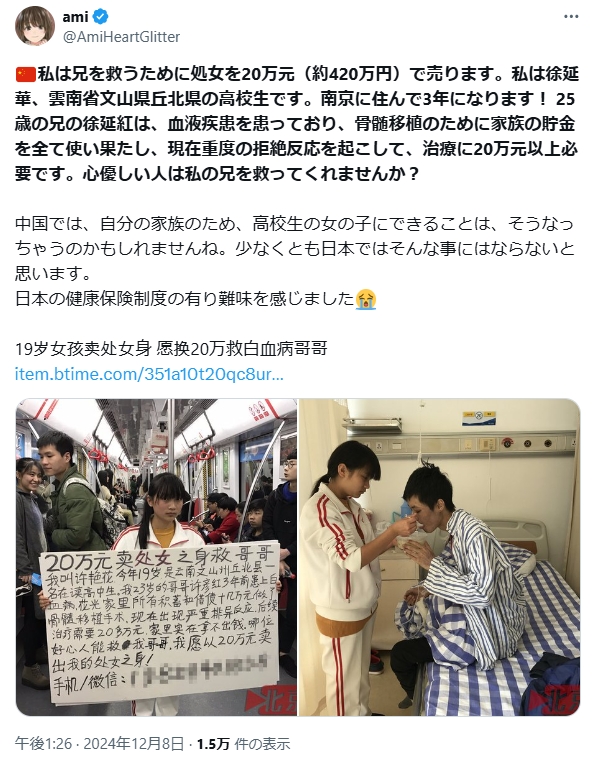 Xユーザーのamiさん: 「🇨🇳私は兄を救うために処女を20万元(約420万円)で売ります。私は徐延華、雲南省文山県丘北県の高校生です。南京に住んで3年になります! https://t.co/zx8cTalT8I」 / X