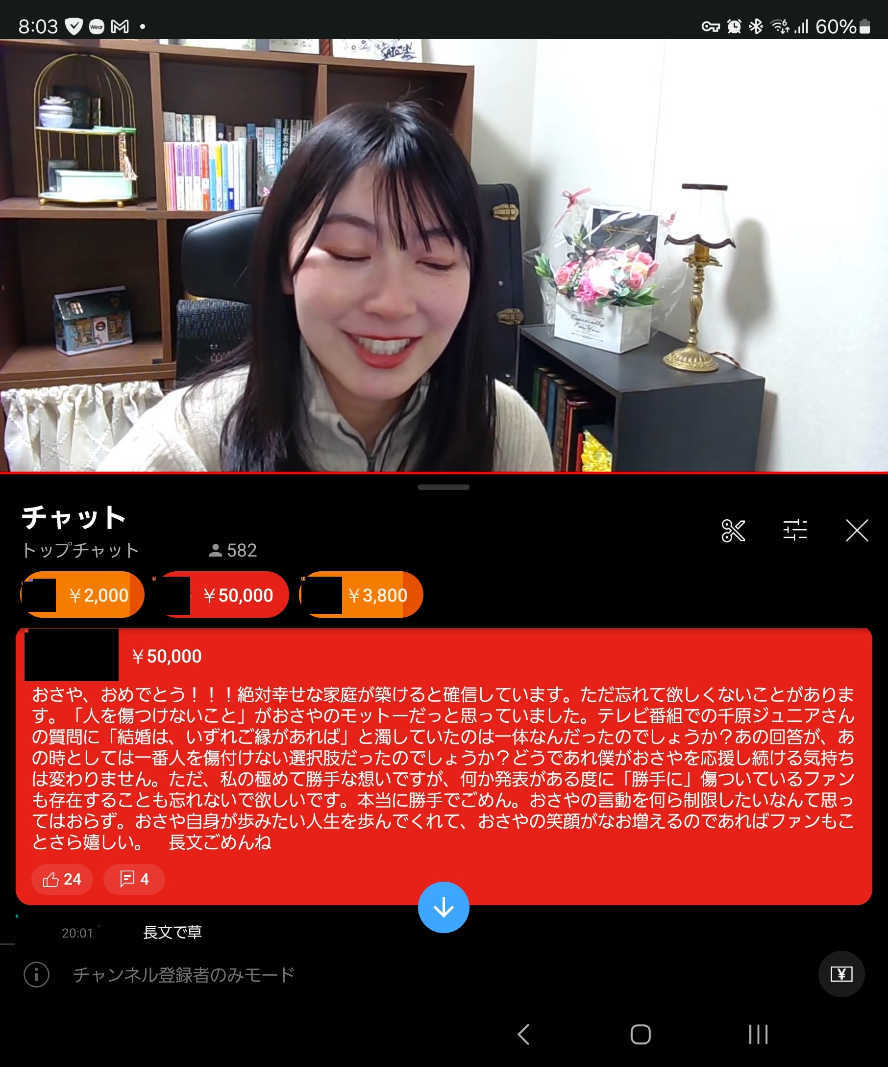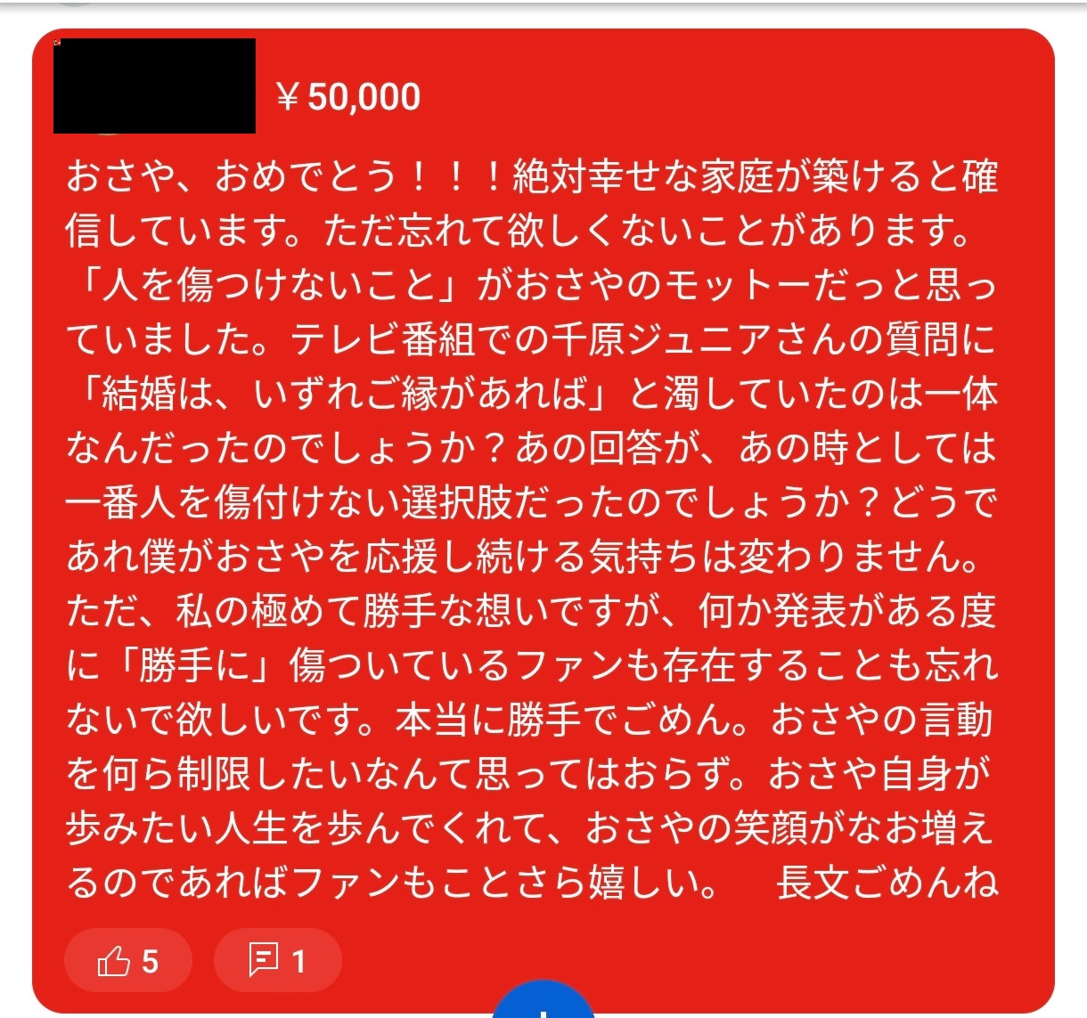 【悲報】檜山沙耶(おさや)ファン、結婚報道に5万円払ってお気持ち表明wwwwwww 2024/12/14 暇人\^o^/速報 1: それでも動く名無し 2024/12/13(金) 20:15:07.02 ID:FG1Q99b80 6: それでも動く名無し 2024/12/13(金) 20:19:34.73 ID:Bo4O/toS0 また負けたのか 9: それでも動く名無し 2024/12/13(金) 20:21:33.78 ID:TY5wABHX0 ですます口調なのに突然ごめんねとか恋人ぶってて怖い 続きを読む Source: 暇人\^o^/速報