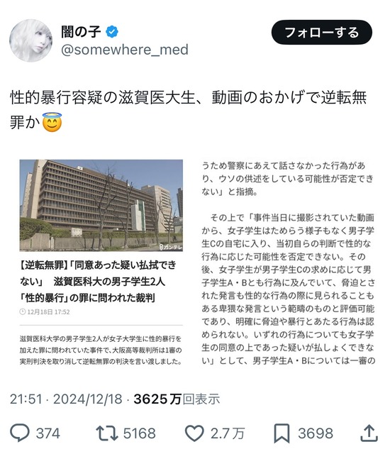 滋賀医大のレ●プ事件、相手が同意している動画が発掘され逆転無罪に