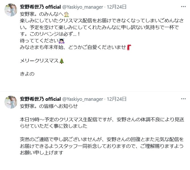 突如の体調不良によりクリスマス生配信中止