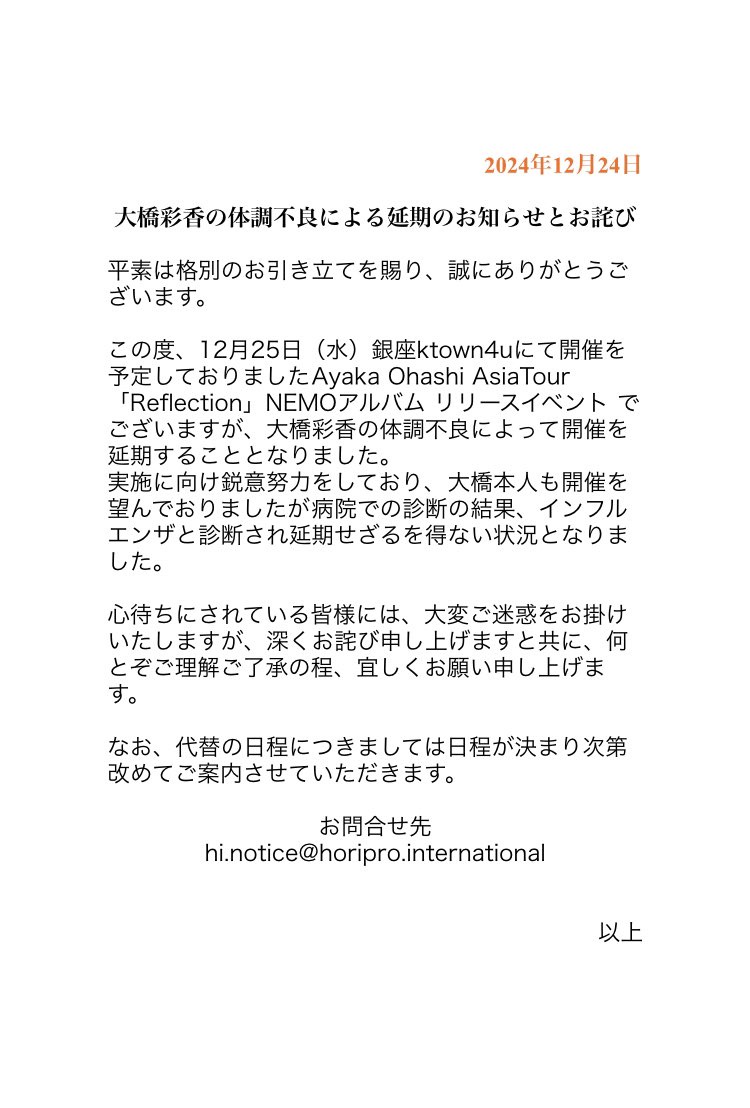 インフルエンザによりクリスマスのリリイベ延期