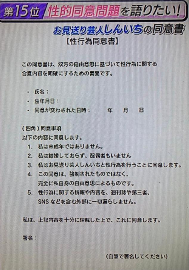 しんいちは、同意書を取り出すと「これに全部書いてもらっています。紙で用意しています。ペン持って、自分の名前を書いてもらう」と告白。「未成年ではありません」「結婚しておらず、配偶者もおりません」「性行為を行うことに同意します」などといった項目が並んでいる。