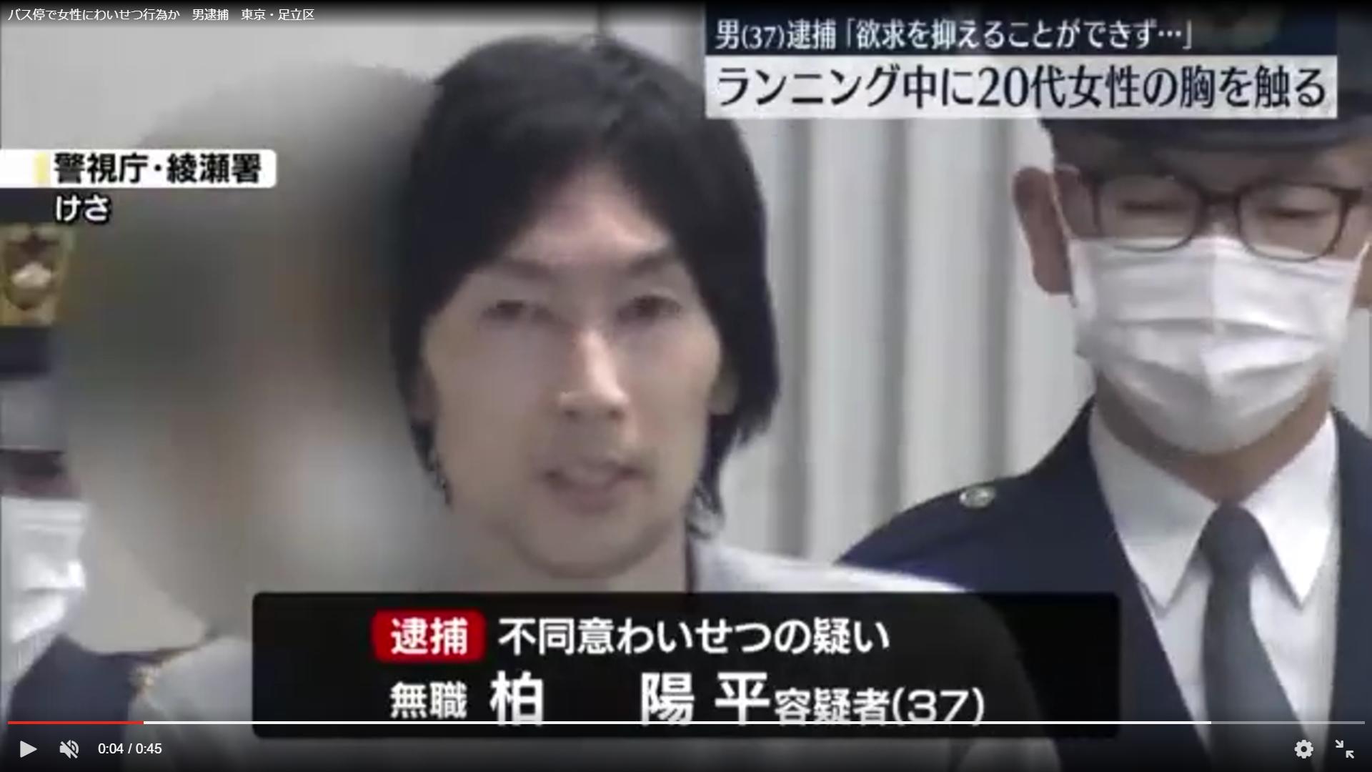 バス停で女性にわいせつ行為か 男逮捕 東京・足立区(日テレNEWS NNN) – Yahoo!ニュース東京・足立区で、バスを待っていた20代の女性にわいせつな行為をしたとして、37歳の男が逮捕されました。(中略)柏容疑者は事件当時、ランニングをしていて、その途中でバスを待っていた女性を見つけ、突然、背後から胸を触ったということです。女性は抵抗し振りほどこうとしましたが、柏容疑者は触り続けたとみられています。2人に面識はないとみられ、調べに対し柏容疑者は「欲求を抑えることができずやってしまった」と容疑を認めているということです。全文はこちらhttps://news.yahoo.co.jp/articles/9f4258cd63cb018b23b4b1bc6386dfad2c601a1c