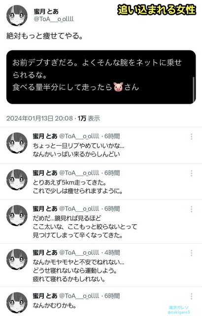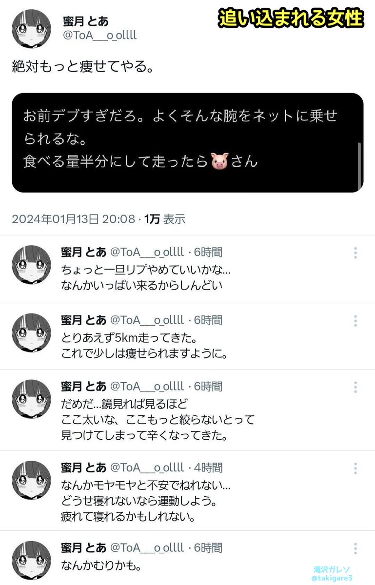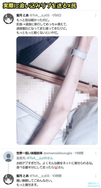 実行に移す鬼畜X民が続出#本日のトゥイッター #拒食症 #拒食 pic.twitter.com/8X79xd7M87— 滝沢ガレソ (@tkzwgrs) January 13, 2024