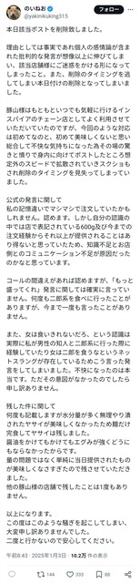 二郎系ラーメン豚山騒動の女さん、青バッジ付けて謝罪「やっぱり全マシマシ注文してたかも⋯」 2025/1/3 キニ速 1:名無し :2025/01/03(金) 09:20:23.783ID:WBTOXSreP 3:名無し :2025/01/03(金) 09:21:59.607ID:hVdowcM0d 全体的にもあれやけど最後の捨てぜりふで台無しにしとるな 17:名無し :2025/01/03(金) 09:24:30.594ID:Eq5QMv3Hj 火に背脂注ぐなよ 続きを読む Source: キニ速