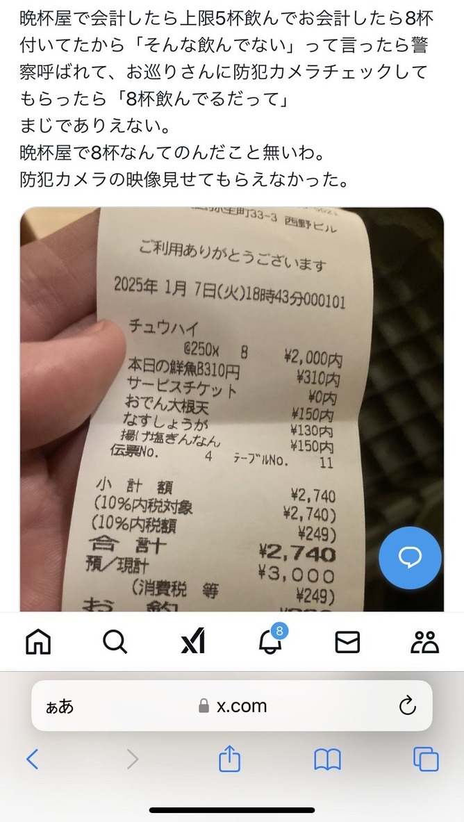 ・警察到着後に、警察官と従業員にて防犯カメラを確認したところ、提供商品と会計内容に誤りは無かった。— 晩杯屋【公式】 (@bampirePR) January 8, 2025