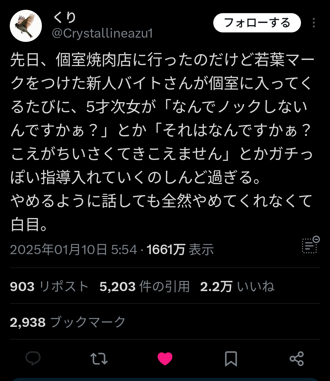 【悲報】女さん「うちの5歳の娘が新人バイトにガチ目の説教しちゃうんだけど…ほんと困ってるwww」 2025/1/11 キニ速 1:名無し: 2025/01/11(土) 02:44:47.078 ID:UbYOvKVvr 3:名無し: 2025/01/11(土) 02:45:17.643 ID:3pA6COnL4 かわよ 5:名無し: 2025/01/11(土) 02:45:42.107 ID:UbYOvKVvr 8:名無し: 2025/01/11(土) 02:46:03.503 ID:UbYOvKVvr 続きを読む Source: キニ速