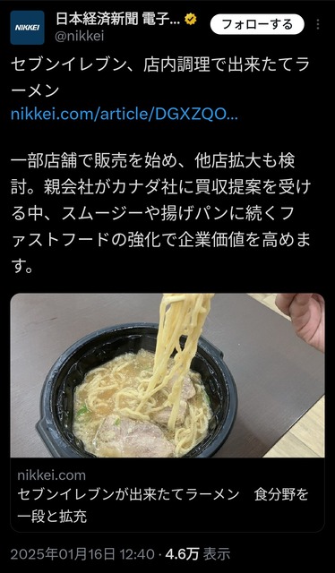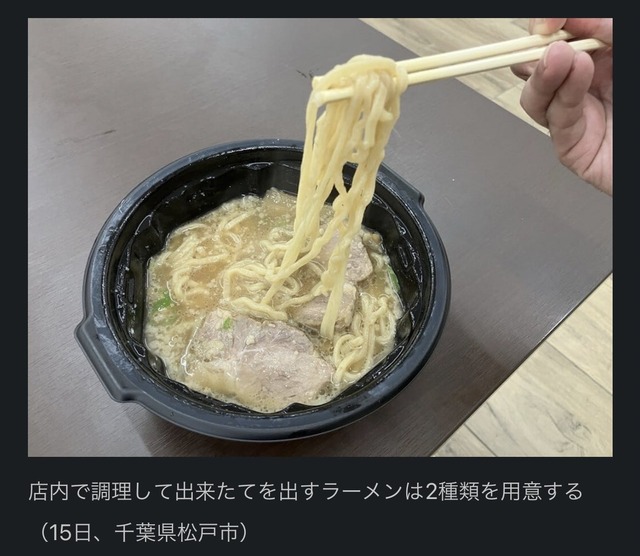 日本経済新聞セブン―イレブン・ジャパンは、千葉県などの一部店舗において店内で調理して出来たてで提供するラーメンの販売を始めた。しょうゆと味噌味の2種類を用意する。店内で揚げたカレーパンや焼き菓子などに続きファストフードを前面に打ち出す。