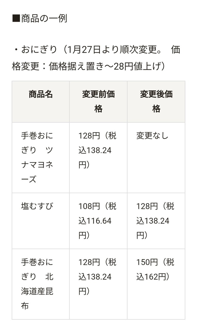 原材料や容器・包材の価格高騰や物流コストの上昇等の影響が続いておりますが、とりわけ昨今、米の価格が上昇しております。こういった状況の中、サプライチェーン全体を通じて生産性の向上や規格の見直し等を行うことで商品価格への影響を小さくする努力を続けてまいりましたが、やむを得ず、おにぎり、お弁当といった米飯商品の一部商品において、価格・規格の見直しをさせていただくことになりました。何卒ご理解を賜りますようよろしくお願い申し上げます。