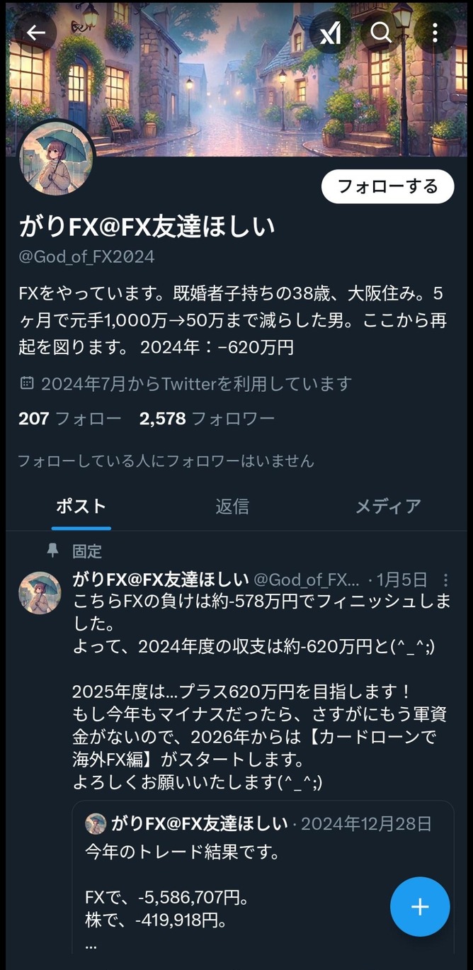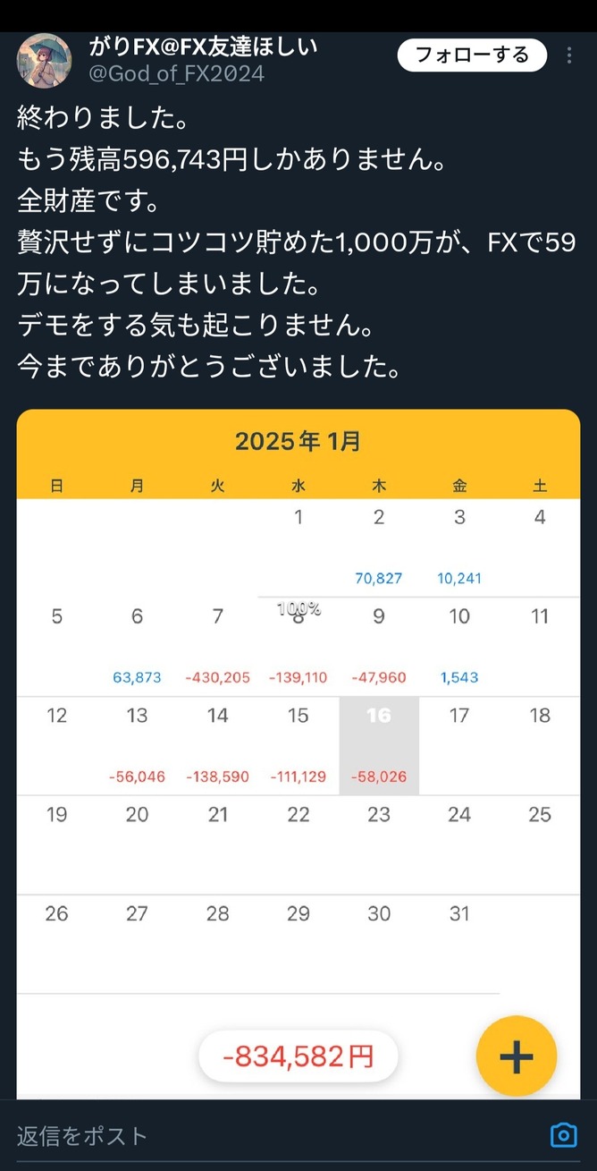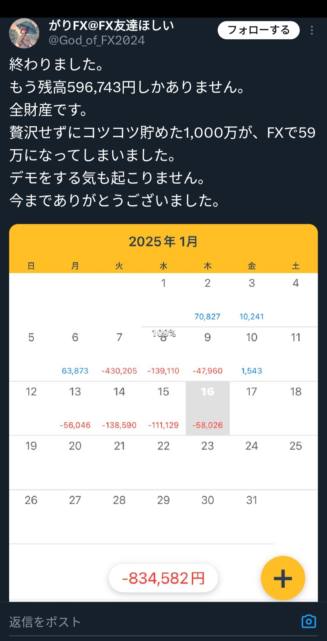 今までありがとうございました。 pic.twitter.com/Totdc57DlA— がりFX@FX友達ほしい (@God_of_FX2024) January 16, 2025