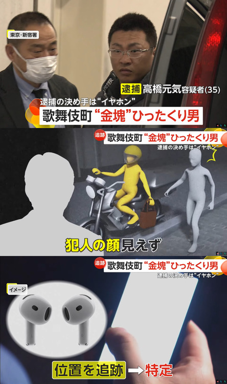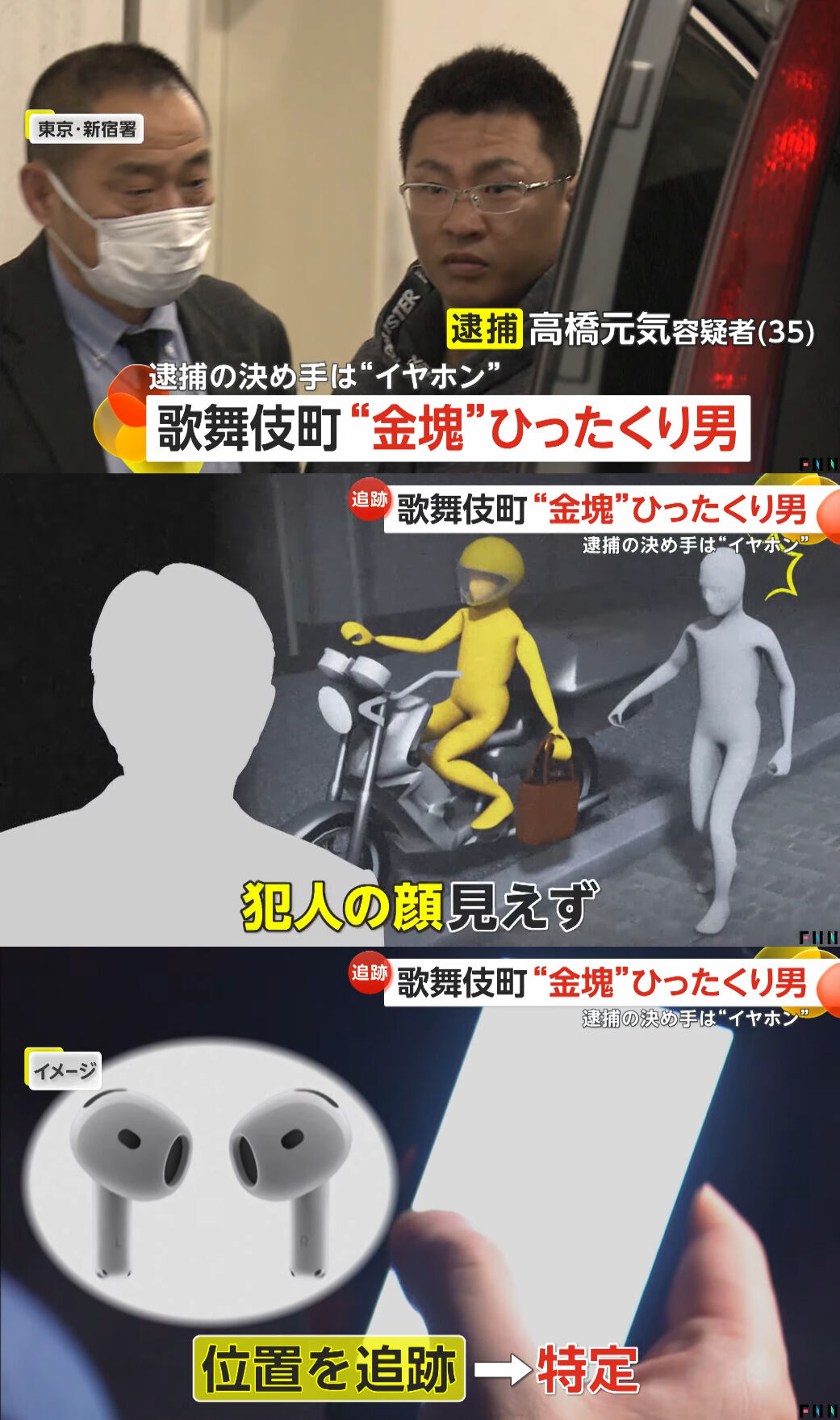 エアポッズありがとう【追跡】逮捕の決め手は“イヤホン”の位置情報 歌舞伎町“金塊”ひったくり高橋元気容疑者(35)「狙うのは手にバッグ持っている人」被害額は約85万円 東京・新宿区 #FNNプライムオンライン https://t.co/qzF3VgBrkM