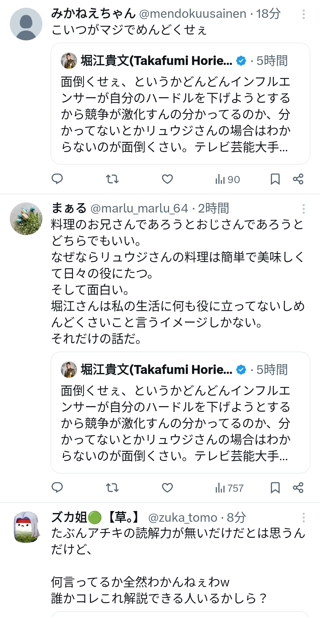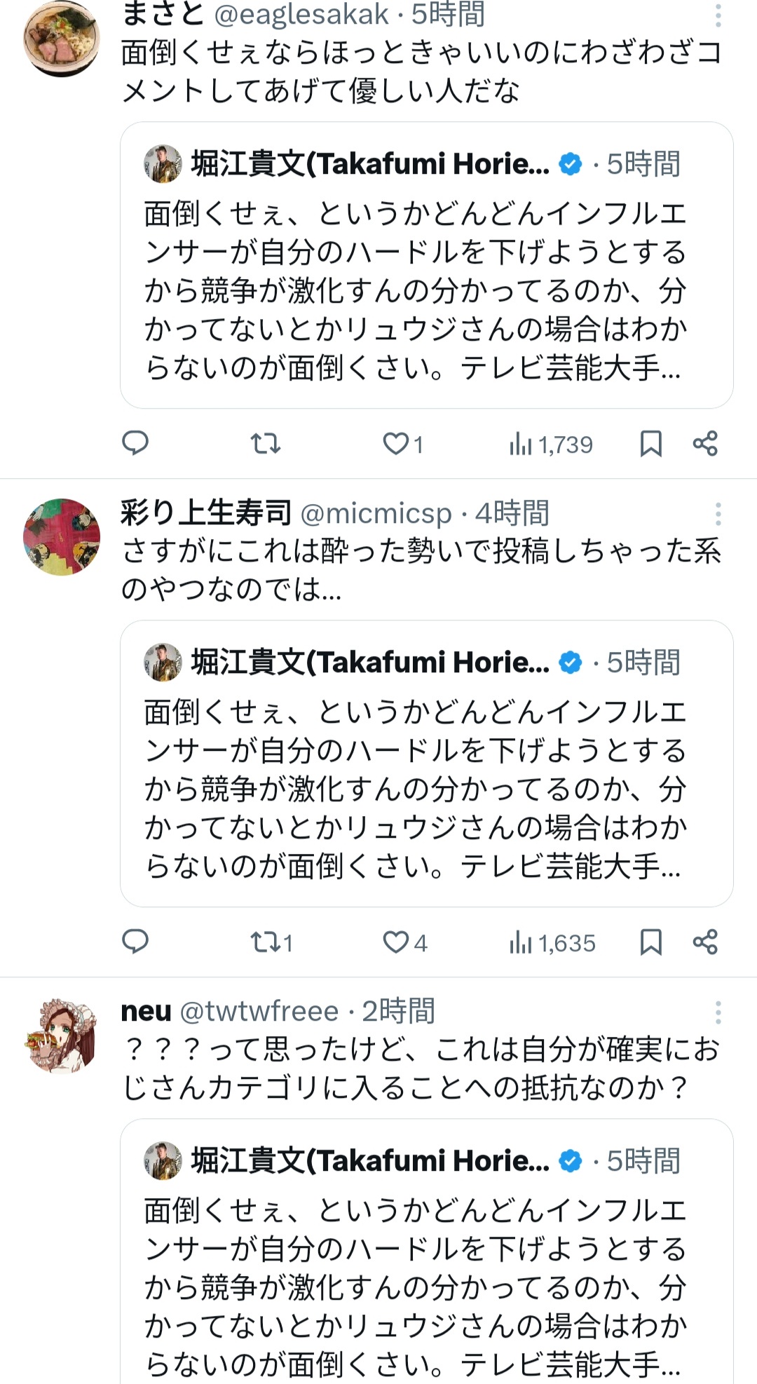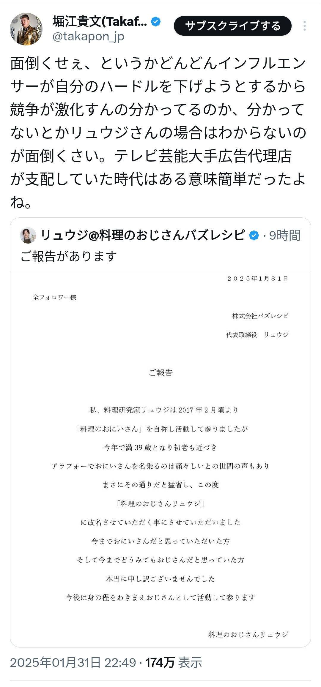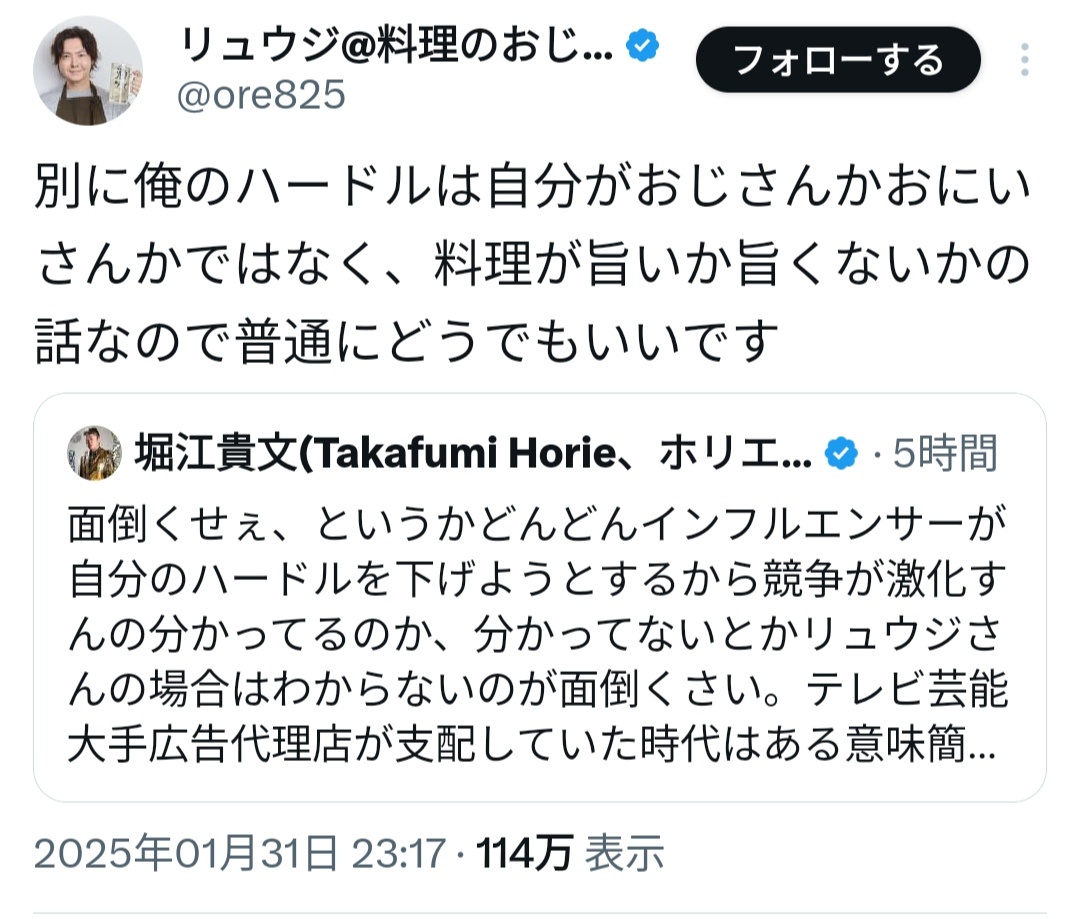 リュウジ「おにいさんからおじさんに改名します」ホリエモン「あのさぁ…」 2025/2/1 キニ速 1:名無し :2025/02/01(土) 07:24:38.883ID:5Tc4smGap ホリ X民の反応 リュウジのお言葉 2:名無し :2025/02/01(土) 07:25:41.629ID:JQYrlo63U これは女の子 8:名無し :2025/02/01(土) 07:30:26.912ID:Ew5H7dicI 野菜が切れてたんやろな 19:名無し :2025/02/01(土) 07:31:58.096ID:tguzI0.TP 一応さん付けなの草 続きを読む Source: キニ速