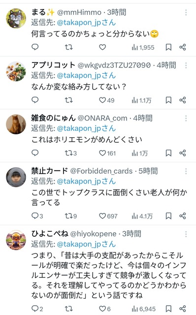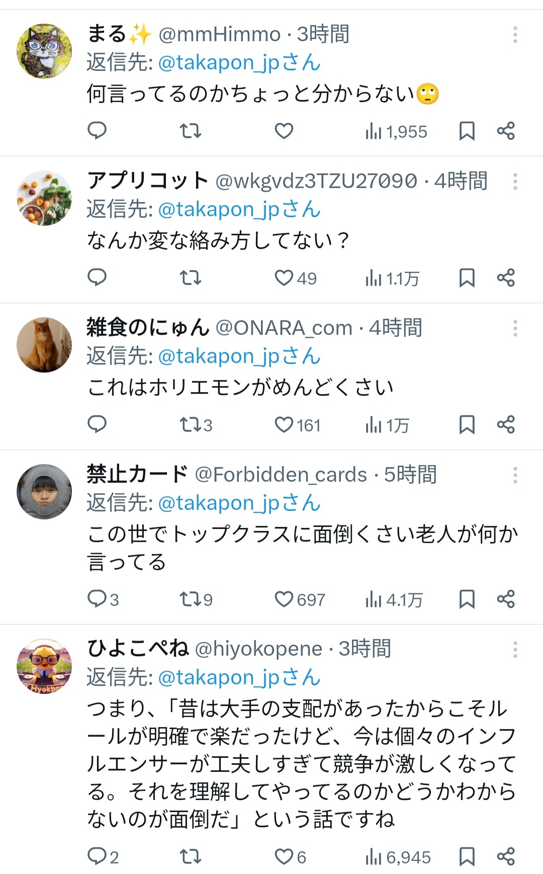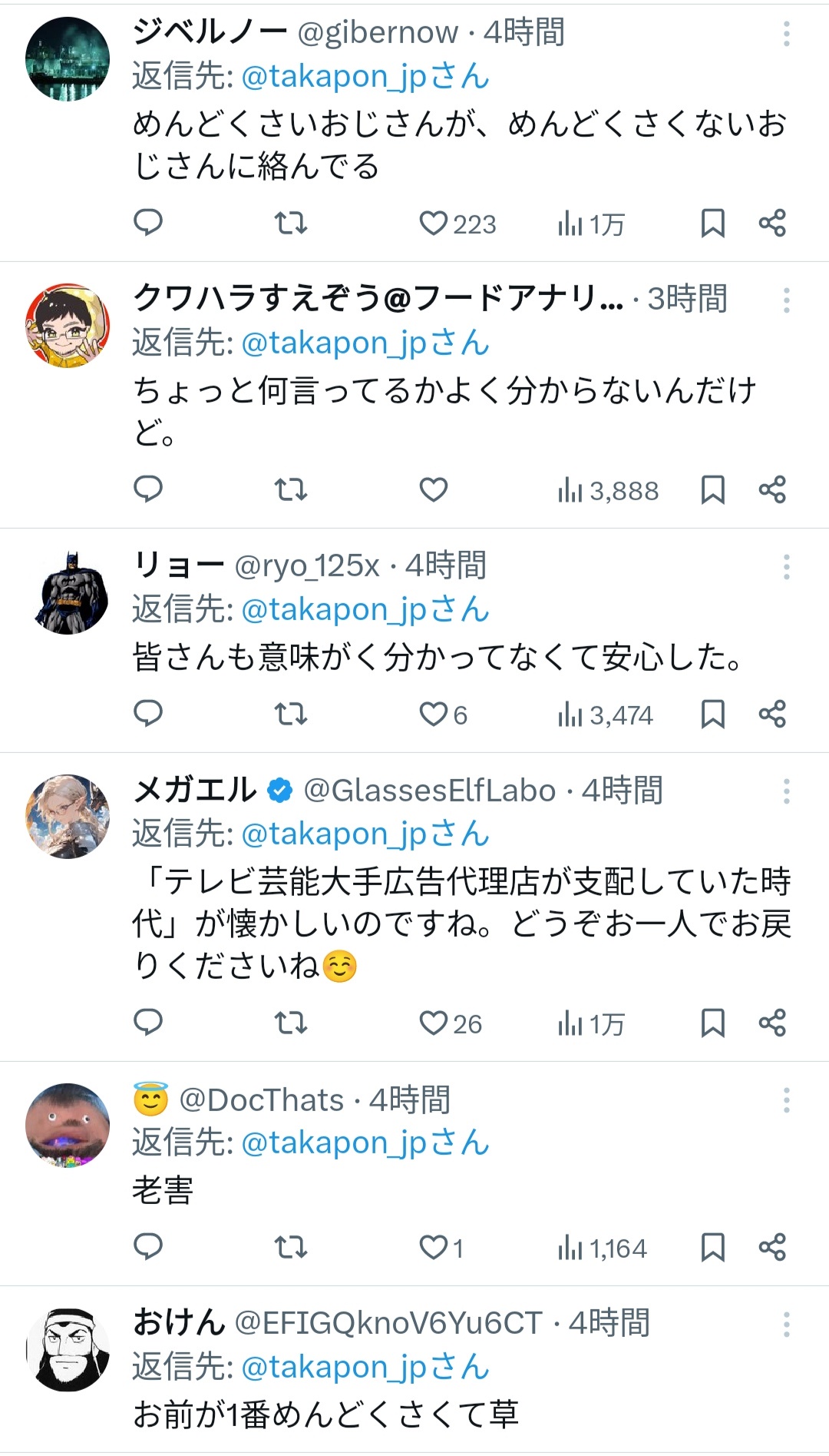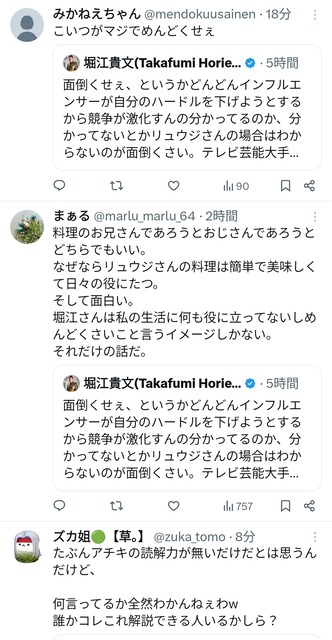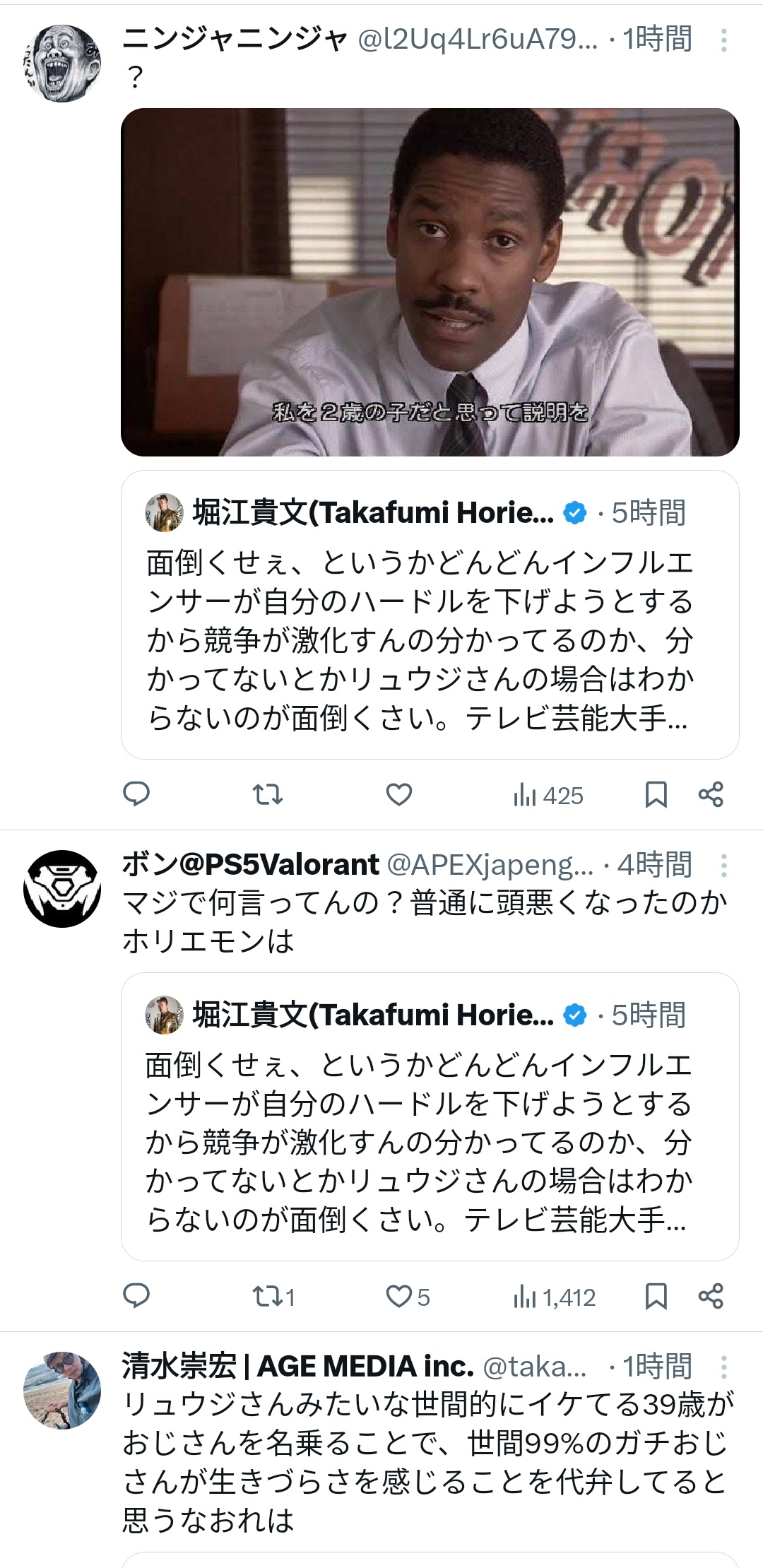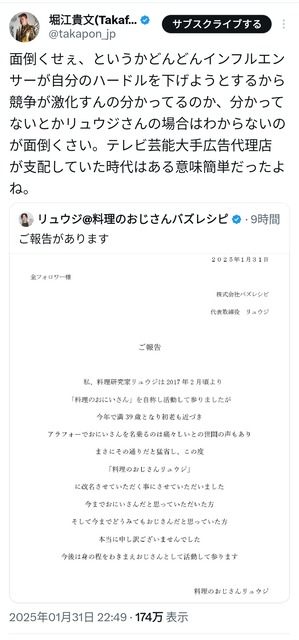 リュウジ「おにいさんからおじさんに改名します」ホリエモン「あのさぁ…」 2025/2/1 キニ速 1:名無し :2025/02/01(土) 07:24:38.883ID:5Tc4smGap ホリ X民の反応 リュウジのお言葉 2:名無し :2025/02/01(土) 07:25:41.629ID:JQYrlo63U これは女の子 8:名無し :2025/02/01(土) 07:30:26.912ID:Ew5H7dicI 野菜が切れてたんやろな 19:名無し :2025/02/01(土) 07:31:58.096ID:tguzI0.TP 一応さん付けなの草 続きを読む Source: キニ速