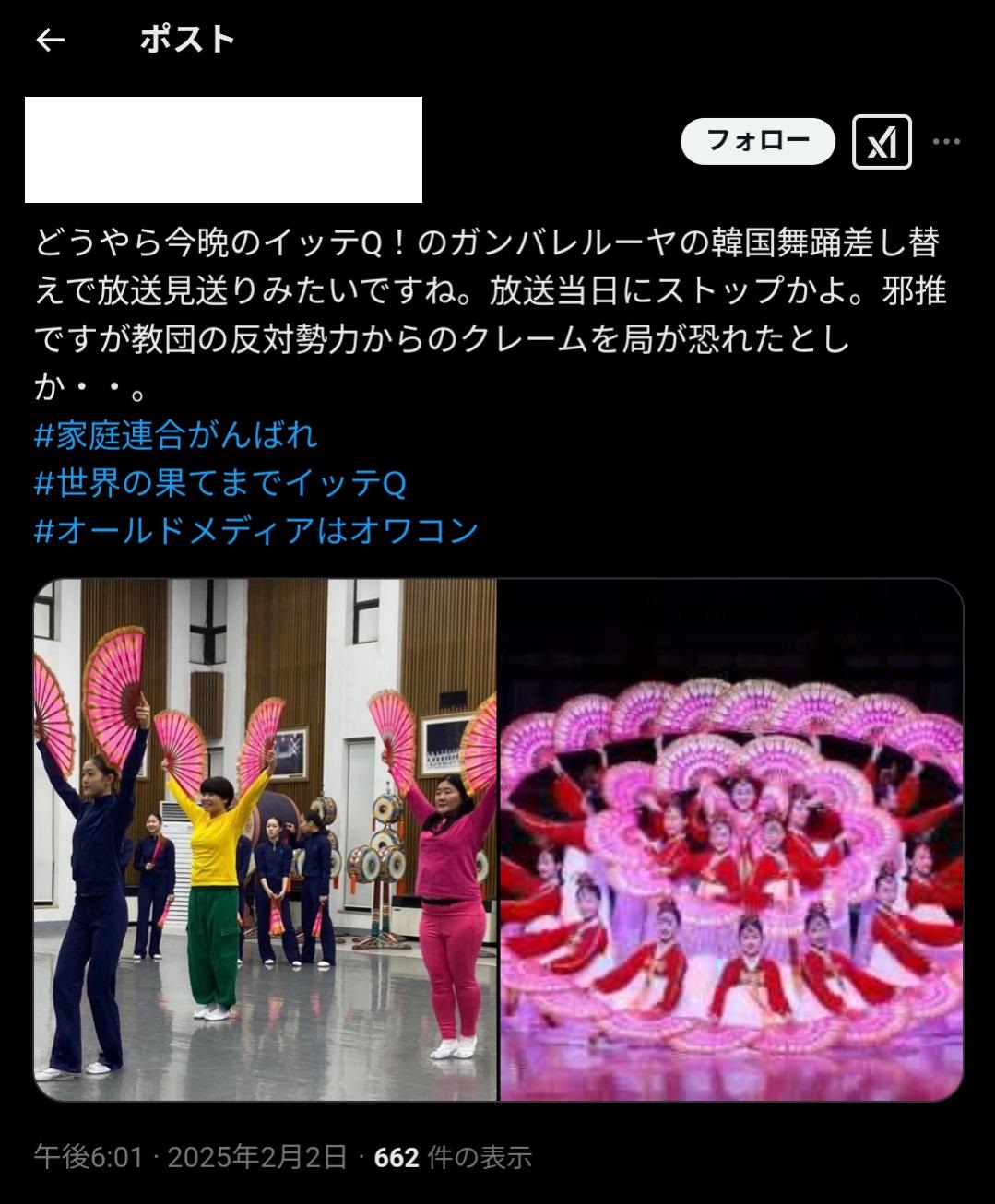 統一教会の信者やシンパが湧き立って前宣伝したために、今夜の「世界の果てまでイッテQ!」で統一教会のリトルエンジェルスが紹介予定だったことが判り、直前に差し替えとなったということ。これでまたあの界隈が騒ぎ立てるのだろう。
