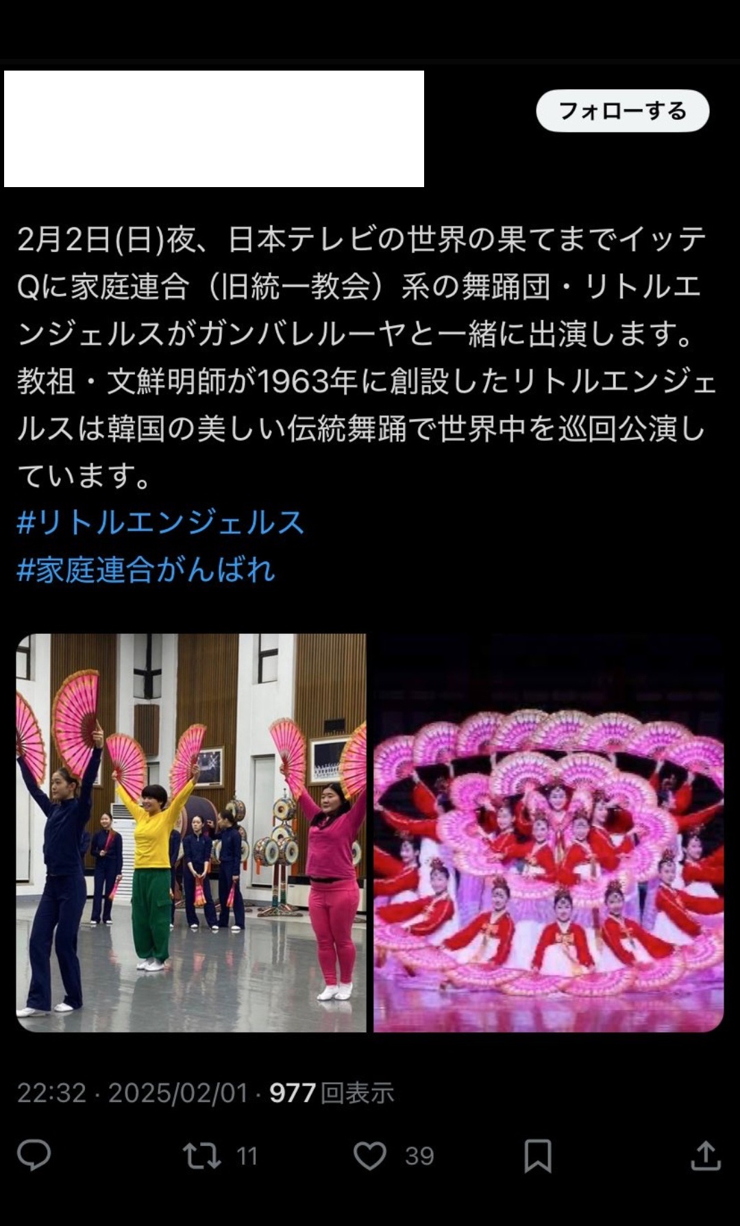 信者が大喜びで宣伝していたので、統一教会のリトルエンジェルス芸術団を紹介してしまう内容だということを何らかの経由で日本テレビの制作サイドが知るに至ったのだろう。反社会的な団体への対応として、放送前に統一教会側へ宣伝材料を与えることをストップできたのは良かったと思う https://t.co/m81TLsRrik