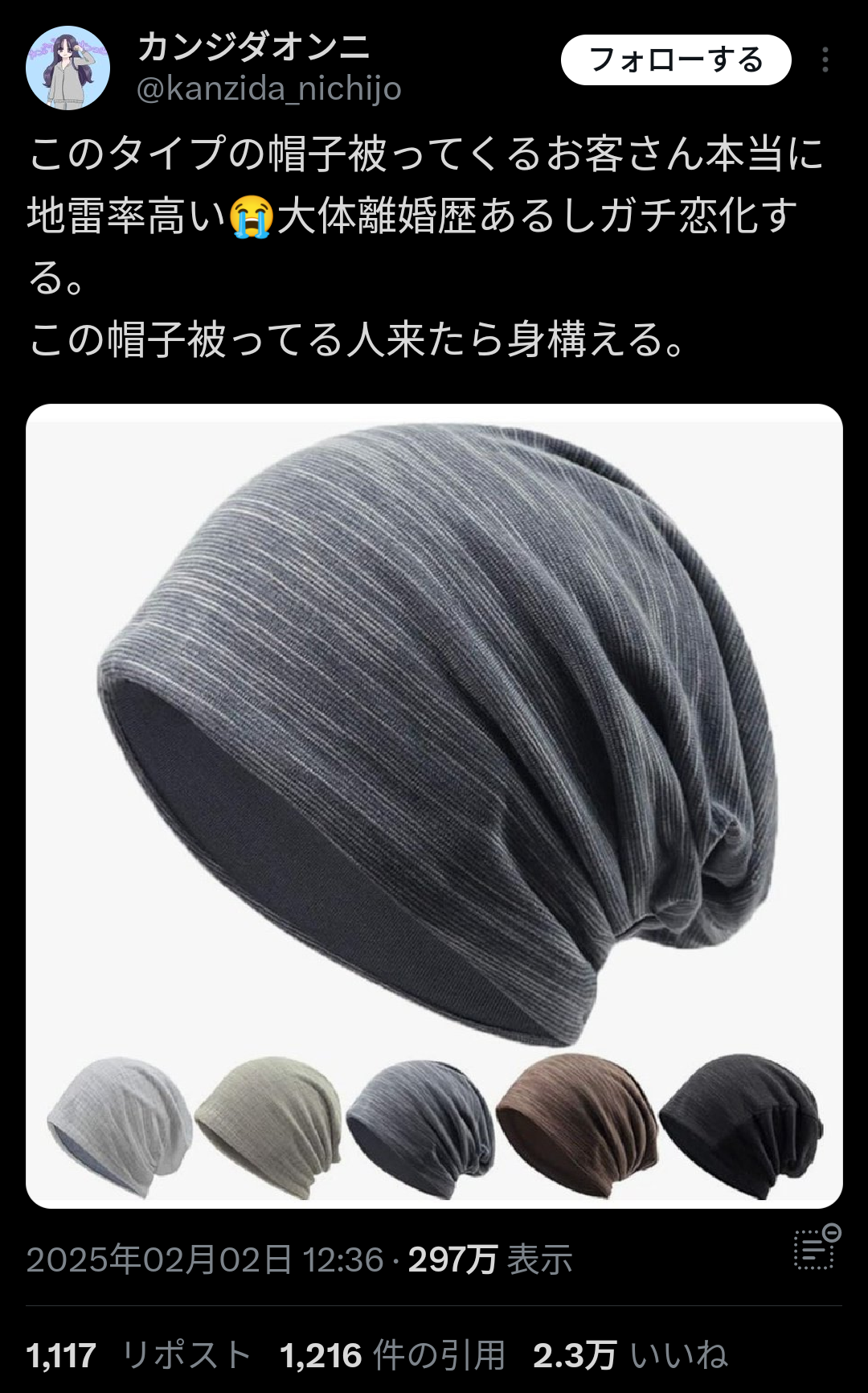 嬢「このタイプの帽子被ってるおっさん、大体離婚歴あるしガチ恋するから身構える」 2025/2/3 キニ速 1:名無し: 2025/02/03(月) 07:08:45.987 ID:jB5DwoOAl 2:名無し: 2025/02/03(月) 07:08:55.527 ID:jB5DwoOAl 何かの参考になれば 4:名無し: 2025/02/03(月) 07:09:48.795 ID:yCQPgaYd8 押井守定期 続きを読む Source: キニ速