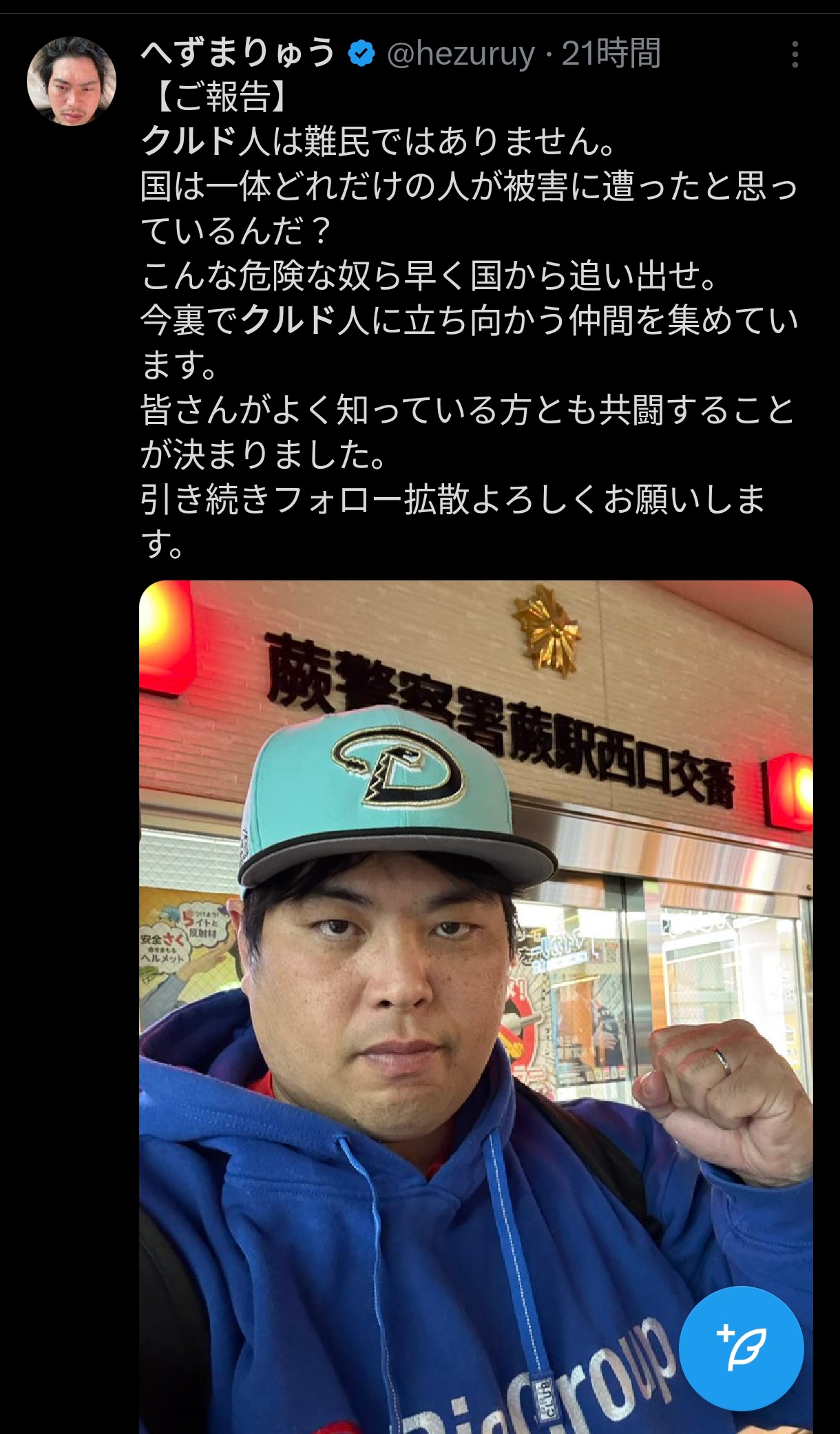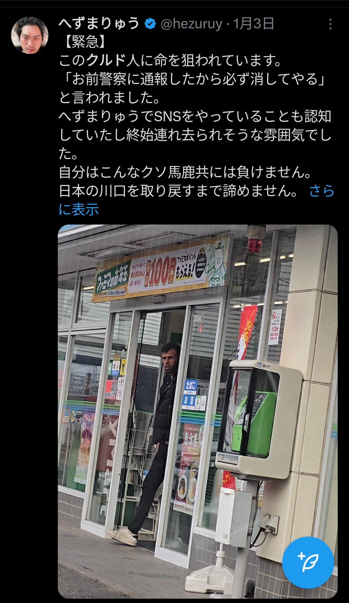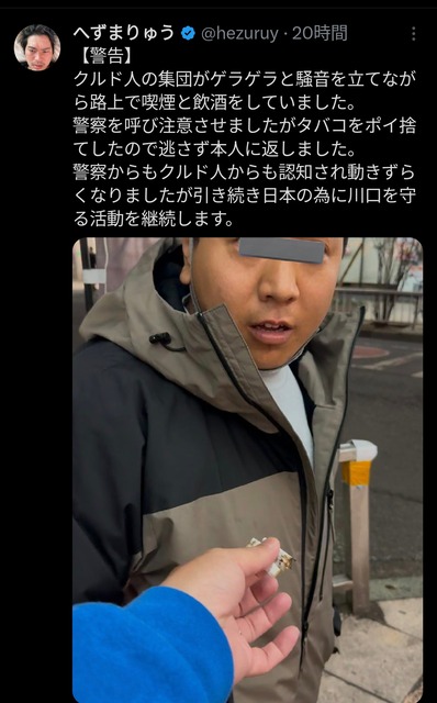 警察からもクルド人からも認知され動きずらくなりましたが引き続き日本の為に川口を守る活動を継続します。 pic.twitter.com/oHD1Xgb58N— へずまりゅう (@hezuruy) February 1, 2025